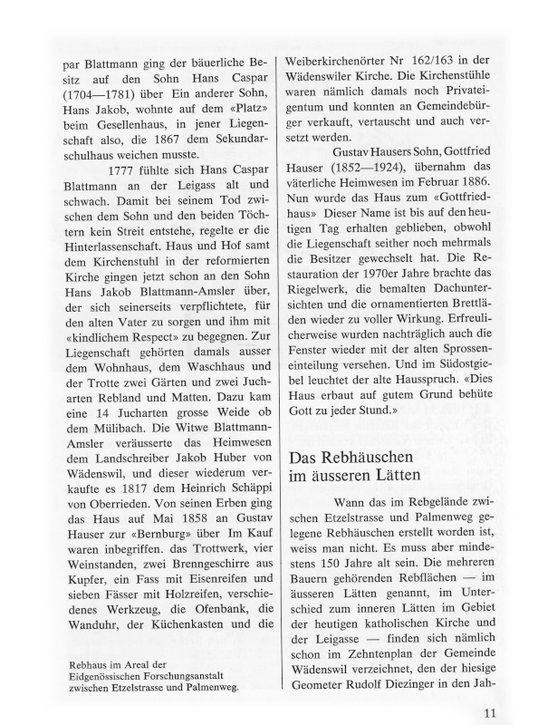 1777 fühlte sich Hans Caspar Blattmann an der Leigass alt und schwach. Damit bei seinem Tod zwischen dem Sohn und den beiden Töchtern kein Streit entstehe, regelte er die Hinterlassenschaft. Haus und Hof samt dem Kirchenstuhl in der reformierten Kirche gingen jetzt schon an den Sohn Hans Jakob Blattmann-Amsler über, der sich seinerseits verpflichtete, für den alten Vater zu sorgen und ihm mit «kindlichem Respect» zu begegnen. Zur Liegenschaft gehörten damals ausser dem Wohnhaus, dem Waschhaus und der Trotte zwei Gärten und zwei Jucharten Rebland und Matten. Dazu kam eine 14 Jucharten grosse Weide ob dem Mülibach. Die Witwe Blattmann-Amsler veräusserte das Heimwesen dem Landschreiber Jakob Huber von Wädenswil, und dieser wiederum verkaufte es 1817 dem Heinrich Schäppi von Oberrieden. Von seinen Erben ging das Haus auf Mai 1858 an Gustav Hauser zur «Bernburg» über. Im Kauf waren inbegriffen: das Trottwerk, vier Weinstanden, zwei Brenngeschirre aus Kupfer, ein Fass mit Eisenreifen und sieben Fässer mit Holzreifen, verschiedenes Werkzeug, die Ofenbank, die Wanduhr, der Küchenkasten und die Weiberkirchenörter Nr. 162/163 in der Wädenswiler Kirche. Die Kirchenstühle waren nämlich damals noch Privateigentum und konnten an Gemeindebürger verkauft, vertauscht und auch versetzt werden.