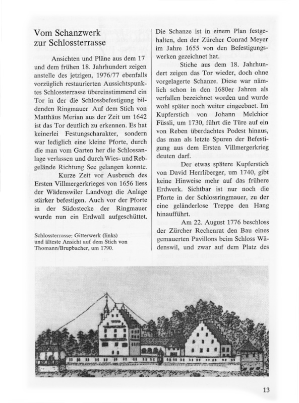 Ansichten und Pläne aus dem 17. und dem frühen 18. Jahrhundert zeigen anstelle des jetzigen, 1976/77 ebenfalls vorzüglich restaurierten Aussichtspunktes Schlossterrasse übereinstimmend ein Tor in der die Schlossbefestigung bildenden Ringmauer. Auf dem Stich von Matthäus Merian aus der Zeit um 1642 ist das Tor deutlich zu erkennen. Es hat keinerlei Festungscharakter, sondern war lediglich eine kleine Pforte, durch die man vom Garten her die Schlossanlage verlassen und durch Wies- und Rebgelände Richtung See gelangen konnte. Kurze Zeit vor Ausbruch des Ersten Villmergerkrieges von 1656 liess der Wädenswiler Landvogt die Anlage stärker befestigen. Auch vor der Pforte in der Südostecke der Ringmauer wurde nun ein Erdwall aufgeschüttet.