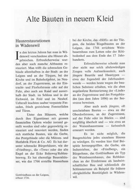 In den letzten Jahren hat man in Wädenswil verschiedene alte Häuser abgebrochen. Erfreulicherweise wurden aber auch manche Altbauten restauriert. Man trifft die schmucken Gebäude allenthalben in der Stadt: an der Leigass und an der Türgass, bei der Kirche und im Bahnhofgebiet, im Neudorf, an der Zugerstrasse, an der Eintracht- und Florhofstrasse oder auf der Fuhr, aber auch am Rand und ausserhalb der Stadt: im Schloss und in der Eichweid, im Feld und im Neuhof. Überall leuchten sauber verputzte Fassaden, frisch gestrichene Fensterläden und Türen.