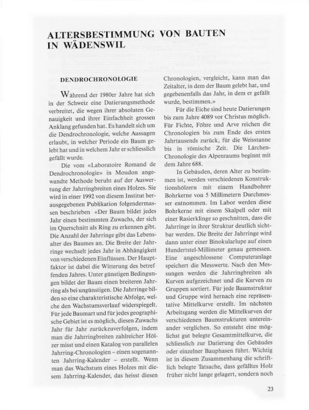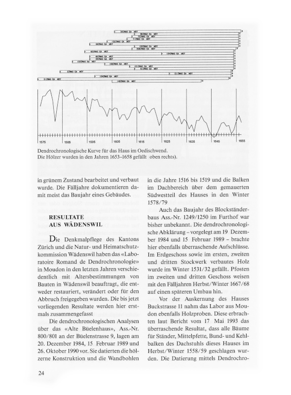 Die Denkmalpflege des Kantons Zürich und die Natur- und Heimatschutzkommission Wädenswil haben das «Laboratoire Romand de Dendrochronologie» in Moudon in den letzten Jahren verschiedentlich mit Altersbestimmungen von Bauten in Wädenswil beauftragt, die entweder restauriert, verändert oder für den Abbruch freigegeben wurden. Die bis jetzt vorliegenden Resultate werden hier erstmals zusammengefasst: