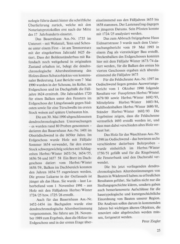 Die bis jetzt vorliegenden dendrochronologischen Altersbestimmungen von Bauten in Wädenswil haben zu erfreulichen Resultaten geführt. Sie halfen nicht nur die Siedlungsgeschichte klären, sondern gaben auch bemerkenswerte Aufschlüsse für die haustypologische und kunstgeschichtliche Einordnung von Bauten unserer Region. Die Analysen sollen darum in kommenden Jahren bei wichtigen älteren Objekten, die renoviert oder abgebrochen werden müssen, fortgesetzt werden.