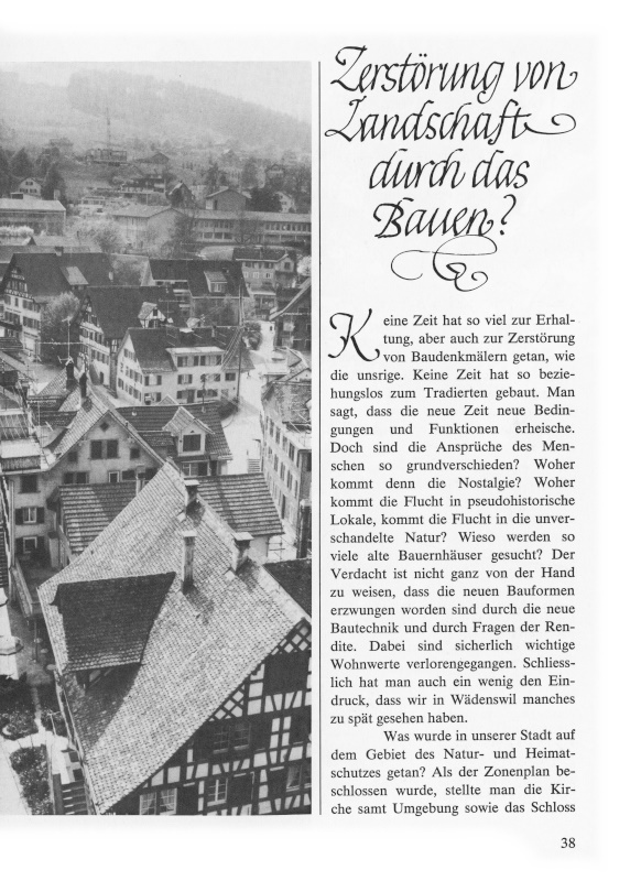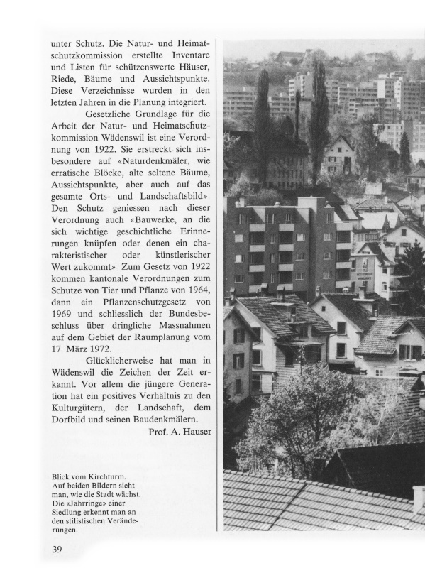 Keine Zeit hat so viel zur Erhaltung, aber auch zur Zerstörung von Baudenkmälern getan, wie die unsrige. Keine Zeit hat so beziehungslos zum Tradierten gebaut. Man sagt, dass die neue Zeit neue Bedingungen und Funktionen erheische. Doch sind die Ansprüche des Menschen so grundverschieden? Woher kommt denn die Nostalgie? Woher kommt die Flucht in pseudohistorische Lokale, kommt die Flucht in die unverschandelte Natur? Wieso werden so viele alte Bauernhäuser gesucht? Der Verdacht ist nicht ganz von der Hand zu weisen, dass die neuen Bauformen erzwungen worden sind durch die neue Bautechnik und durch Fragen der Rendite. Dabei sind sicherlich wichtige Wohnwerte verlorengegangen. Schliesslich hat man auch ein wenig den Eindruck, dass wir in Wädenswil manches zu spät gesehen haben.