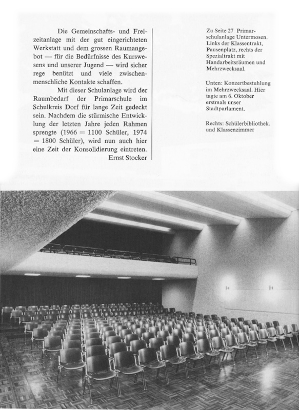 Mit dieser Schulanlage wird der Raumbedarf der Primarschule im Schulkreis Dorf für lange Zeit gedeckt sein. Nachdem die stürmische Entwicklung der letzten Jahre jeden Rahmen sprengte (1966 = 1100 Schüler, 1974 = 1800 Schüler), wird nun auch hier eine Zeit der Konsolidierung eintreten.