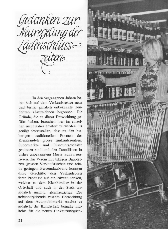 In den vergangenen Jahren haben sich auf dem Verkaufssektor neue und bisher gänzlich unbekannte Tendenzen abzuzeichnen begonnen. Die Gründe, die zu dieser Entwicklung geführt haben, brauchen hier im Einzelnen nicht näher erörtert zu werden. Es genügt festzustellen, dass zu den bisherigen traditionellen Formen des Kleinhandels grosse Einkaufszentren, Supermärkte und Discountgeschäfte gestossen sind und den Detaillisten in bisher unbekanntem Masse konkurrenzieren. Im Verein mit billigen Bauplätzen, grossen Verkaufsflächen und relativ geringem Personalaufwand konnten diese Geschäfte den Verkaufspreis ihrer Produkte auf ein Niveau senken, welches es dem Kleinhändler in der Ortschaft und auch in der Stadt unmöglich machte, gleichzuziehen. Die nebenhergehende rasante Entwicklung auf dem Automobilmarkt machte es möglich, die Kundschaft beinahe mühelos für die neuen Einkaufsmöglichkeiten einzunehmen.
