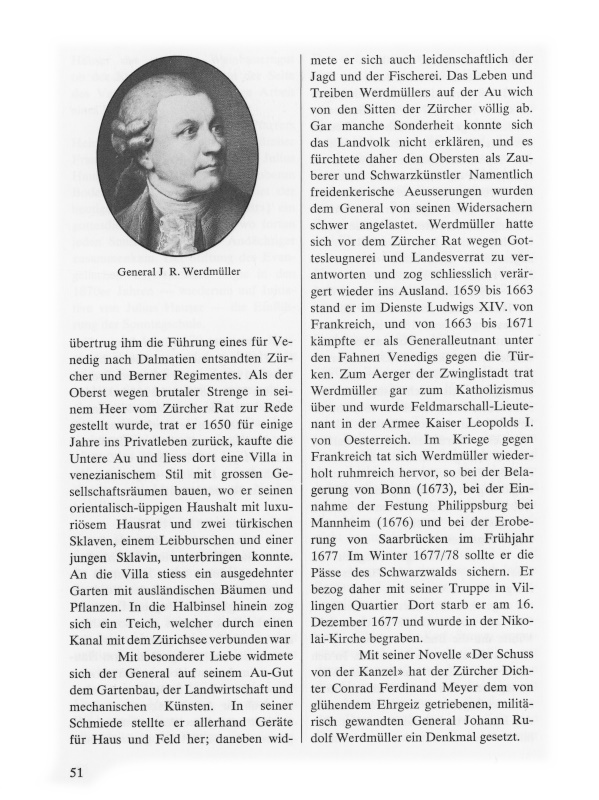 Nach Studienaufenthalten in Genf und in Frankreich kehrte der aus vornehmem Zürcher Ratsgeschlecht stammende Johann Rudolf Werdmüller im Jahre 1633 nach Zürich zurück. Er trat aber nicht ins väterliche Textilunternehmen ein, sondern leistete Kriegsdienst bei den Schweden, wo er 1643 zum Oberst befördert wurde. Aber schon bald rief die Zürcher Regierung den tüchtigen Kriegsmann zurück und übertrug ihm die Führung eines für Venedig und Dalmatien entsandten Zürcher und Berner Regimentes. Als der Oberst wegen brutaler Strenge in seinem Heer vom Zürcher Rat zur Rede gestellt wurde, trat er 1650 für einige Jahre ins Privatleben zurück, kaufte die Untere Au und liess dort eine Villa in venezianischem Stil mit grossen Gesellschaftsräumen bauen, wo er seinen orientalisch-üppigen Haushalt mit luxuriösem Hausrat und zwei türkischen Sklaven, einem Leibburschen und einer jungen Sklavin, unterbringen konnte. An die Villa stiess ein ausgedehnter Garten mit ausländischen Bäumen und Pflanzen. In die Halbinsel hinein zog sich ein Teich, welcher durch einen Kanal mit dem Zürichsee verbunden war.