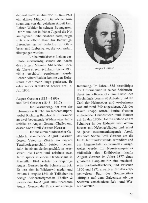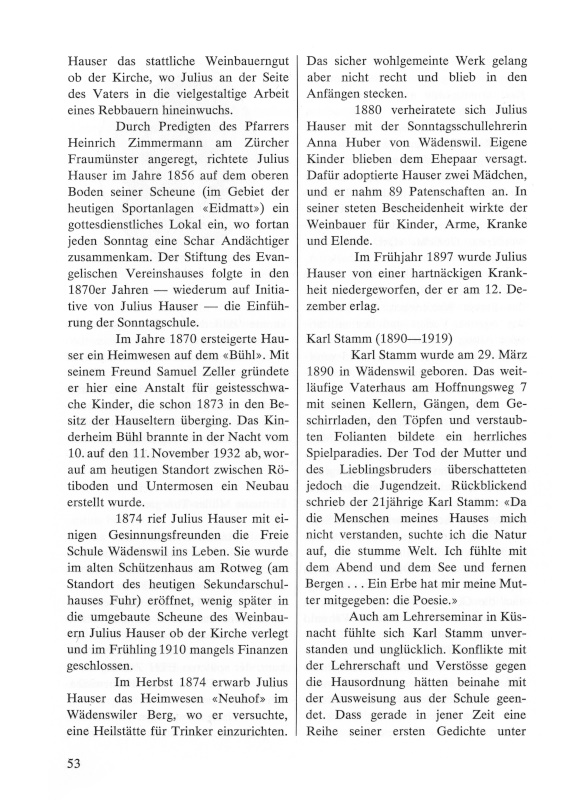 Durch Predigten des Pfarrers Heinrich Zimmermann am Zürcher Fraumünster angeregt, richtete Julius Hauser im Jahre 1856 auf dem oberen Boden seiner Scheune (im Gebiet der heutigen Sportanlagen «Eidmatt») ein gottesdienstliches Lokal ein, wo fortan jeden Sonntag eine Schar Andächtiger zusammenkam. Der Stiftung des Evangelischen Vereinshauses folgte in den 1870er Jahren − wiederum auf Initiative von Julius Hauser − die Einführung der Sonntagschule.