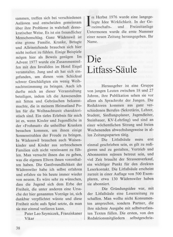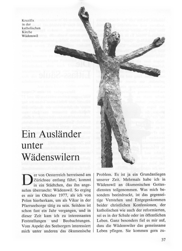 Der von Österreich herreisend an Zürichsee entlang fährt, kommt in ein Städtchen, das ihn angenehm überrascht: Wädenswil. So erging es mir im Oktober 1977, als ich von Polen hierherkam, um als Vikar in der Pfarrseelsorge tätig zu sein. Seitdem ist schon fast ein Jahr vergangen, und in dieser Zeit kam ich zu interessanten Feststellungen und Beobachtungen. Vom Aspekt des SeeIsorgers interessieret mich unter anderen das ökumenische Problem. Es ist ja ein Grundanliegen unserer Zeit. Mehrmals habe ich in Wädenswil an ökumenischen Gottesdiensten teilgenommen. Was mich besonders beeindruckt, ist das gegenseitige Verstehen und Entgegenkommen bei der christlichen Konfessionen, der katholischen wie auch der reformierten, sei es in der Schule oder im öffentlichen Leben. Ganz besonders fiel es mir auf, dass die Wädenswiler das gemeinsame Leben pflegen. Sie kommen gern zusammen, treffen sich bei verschiedenen Anlässen und entscheiden gemeinsam über ihre Probleme in wahrhaft demokratischer Weise. Es ist ein freundlicher Menschenschlag. Ganz Wädenswil ist eine grosse Familie. Kranke, Betagte und Alleinstehende brauchen sich hier nicht isoliert zu fühlen.