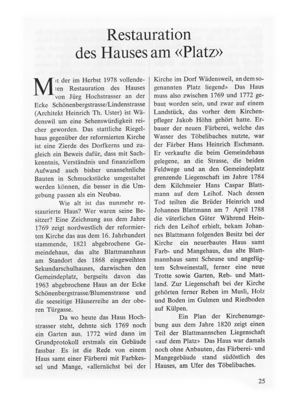 24 Im Herbst 1978 wurde die Restauration des Hauses „am Platz“ Ecke Schönenbergstrasse/Lindenstrasse beendet.