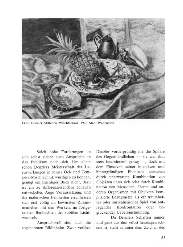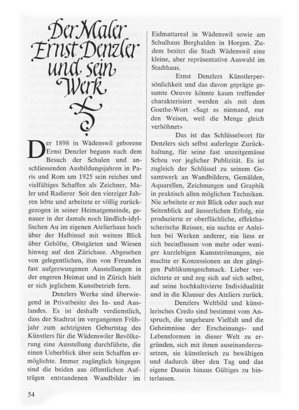 Das ist das Schlüsselwort für Denzlers sich selbst auferlegte Zurückhaltung, für seine fast unzeitgemässe Scheu vor jeglicher Publizität. Es ist zugleich der Schlüssel zu seinem Gesamtwerk an Wandbildern, Gemälden, Aquarellen, Zeichnungen und Graphik in praktisch allen möglichen Techniken. Nie arbeitete er mit Blick oder auch nur Seitenblick auf äusserlichen Erfolg, nie produzierte er oberflächliche, effekthascherische Reisser, nie suchte er Anleihen bei Werken anderer, nie liess er sich beeinflussen von mehr oder weniger kurzlebigen Kunstströmungen, nie machte er Konzessionen an den gängigen Publikumsgeschmack. Lieber verzichtete er und zog sich auf sich selbst, auf seine hochkultivierte Individualtität und in die Klausur des Ateliers zurück.