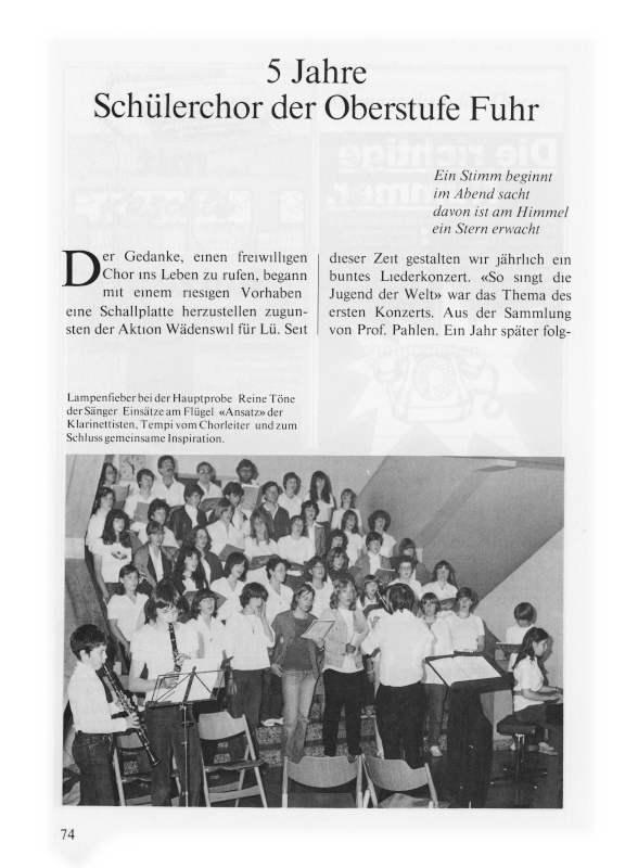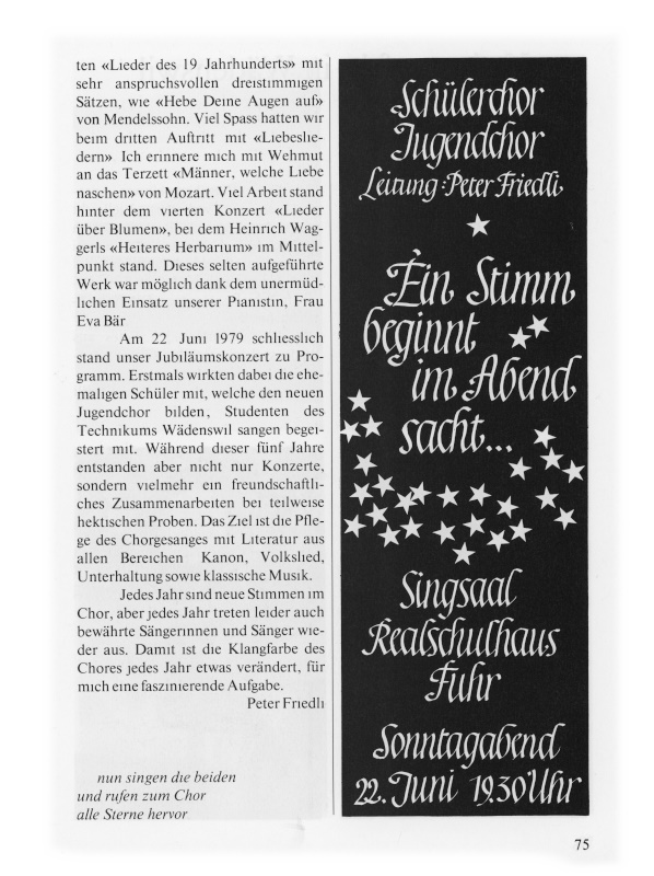 Am 22. Juni 1979 schliesslich stand unser Jubiläumskonzert zu Programm. Erstmals wirkten dabei die ehemaligen Schüler mit, welche den neuen Jugendchor bilden; Studenten des Technikums Wädenswil sangen begeistert mit. Während dieser fünf Jahre entstanden aber nicht nur Konzerte, sondern vielmehr ein freundschaftliches Zusammenarbeiten bei teilweise hektischen Proben. Das Ziel ist die Pflege des Chorgesanges mit Literatur aus allen Bereichen: Kanon, Volkslied, Unterhaltung, sowie klassische Musik.