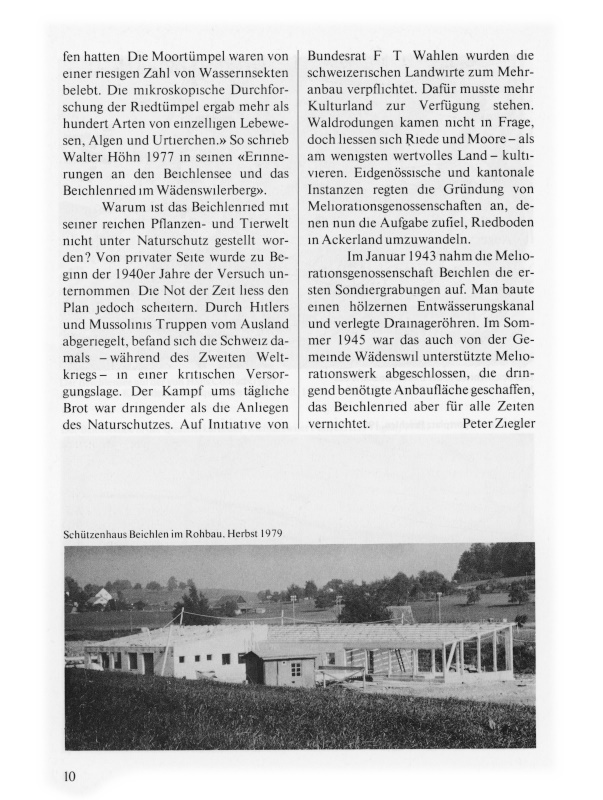 Warum ist das Beichlenried mit seiner reichen Pflanzen-und Tierwelt nicht unter Naturschutz gestellt worden? Von privater Seite wurde zu Beginn der 1940er Jahre der Versuch unternommen. Die Not der Zeit liess den Plan jedoch scheitern. Durch Hitlers und Mussolinis Truppen vom Ausland abgeriegelt, befand sich die Schweiz damals − während des Zweiten Weltkriegs − in einer kritischen Versorgungslage. Der Kampf ums tägliche Brot war dringender als die Anliegen des Naturschutzes. Auf Initiative von Bundesrat F. T. Wahlen wurden die schweizerischen Landwirte zum Mehranbau verpflichtet. Dafür musste mehr Kulturland zur Verfügung stehen. Waldrodungen kamen nicht in Frage, doch liessen sich Riede und Moore − als am wenigsten wertvolles Land − kultivieren. Eidgenössische und kantonale Instanzen regten die Gründung von Meliorationsgenossenschaften an, denen nun die Aufgabe zufiel, Riedboden in Ackerland umzuwandeln.