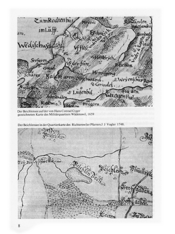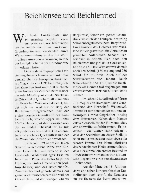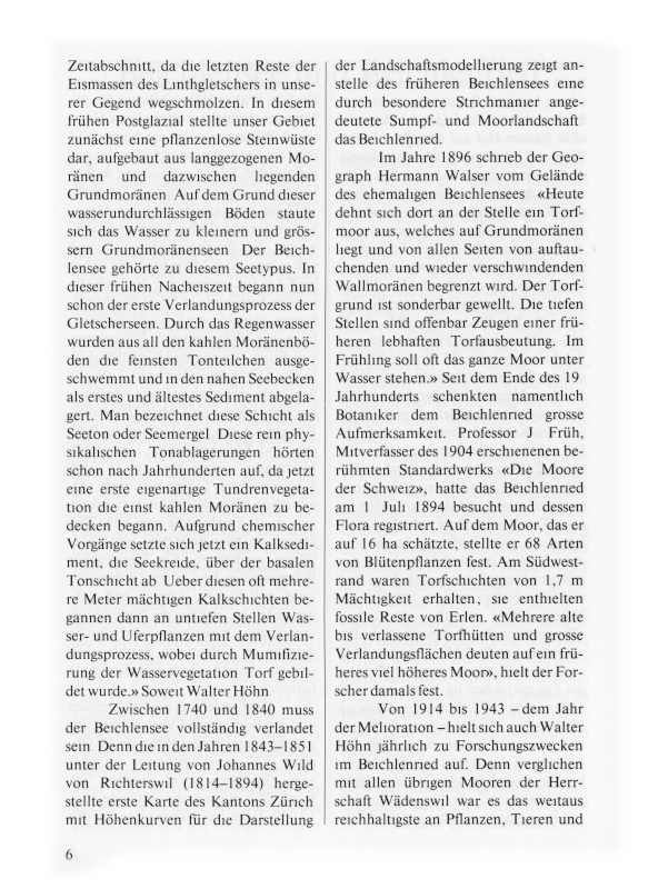 Es war Hochsommerzeit (1914), und die Moorflora stand im Maximum ihrer Entwicklung. Der erste Blick ins Moorzentrum nahm den Beschauer völlig gefangen; denn aus einem grossen Torftümpel leuchteten ihm wohl ein Dutzend weisse Seerosen entgegen, als letzte lebendige Zeugen des einstigen Beichlensees. Jeder der zahlreichen Torfstiche stellte in seiner Gesamtheit eine vielgestaltige Lebensgemeinschaft von Pflanzen und Tieren dar. Sie veranschaulichten auch den klassischen Vorgang eines Verlandungsprozesses. Hier bot sich dem Naturfreund ein Bild des Kampfes ums Dasein unter den Gewächsen ... Als Hauptverlander traten Schilf und Gross-Seggen auf. Die letztgenannten schufen im westlichen Teil des Riedes weitflächige, trügerische Schwingrasen ohne festen Untergrund. Dicht geschlossene Gruppen von Rohrkolben überragten diese Seggenbüsche.