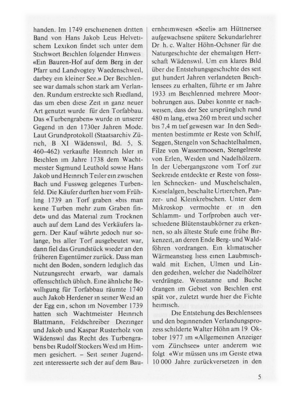 Von 1914 bis 1943 − dem Jahr der Melioration − hielt sich auch Walter Höhn jährlich zu Forschungszwecken im Beichlenried auf. Denn verglichen mit allen übrigen Mooren der Herrschaft Wädenswil war es das weitaus reichhaltigste an Pflanzen, Tieren und verschiedenartigen Lebensformen. 156 verschiedene Arten von Blütenpflanzen und 18 Moosarten liessen sich hier nachweisen; hinzu gestellte sich eine überreiche Sumpf- und Wassertierwelt. Doch lassen wir Walter Höhn selber berichten: