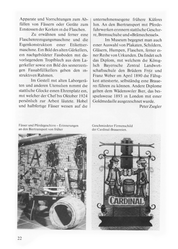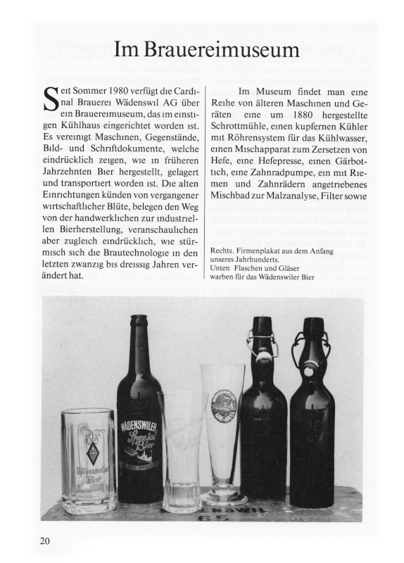 Seit Sommer 1980 verfügt die Cardinal Brauerei Wädenswil AG über ein Brauereimuseum, das im einstigen Kühlhaus eingerichtet worden ist. Es vereinigt Maschinen, Gegenstände, Bild- und Schriftdokumente, welche eindrücklich zeigen, wie in früheren Jahrzehnten Bier hergestellt, gelagert und transportiert worden ist. Die alten Einrichtungen künden von vergangener wirtschaftlicher Blüte, belegen den Weg von der handwerklichen zur industriellen Bierherstellung, veranschaulichen aber zugleich eindrücklich, wie stürmisch sich die Brautechnologie in den letzten zwanzig bis dreissig Jahren verändert hat.
