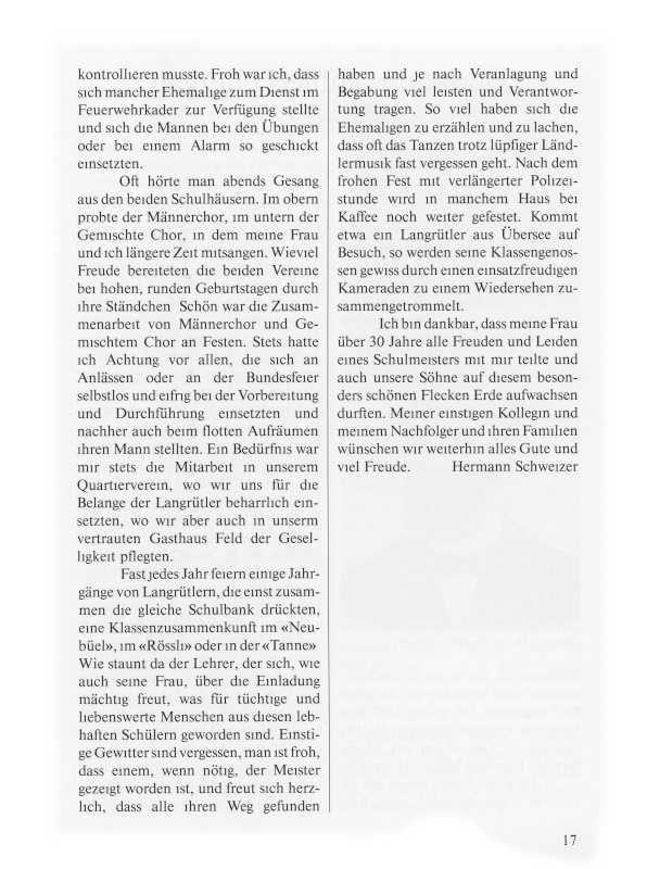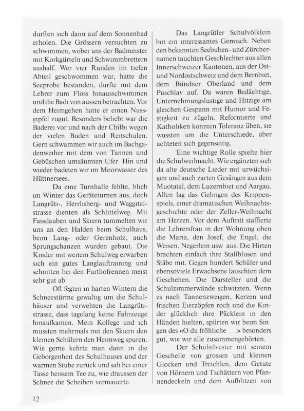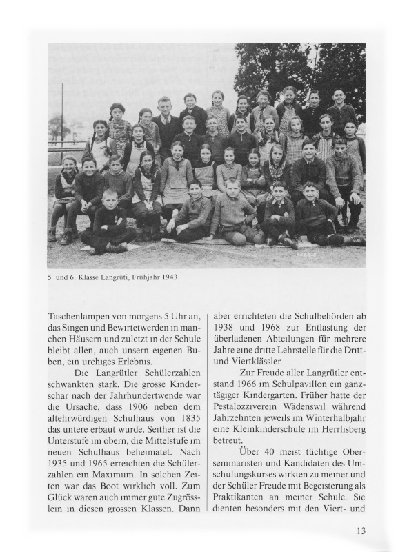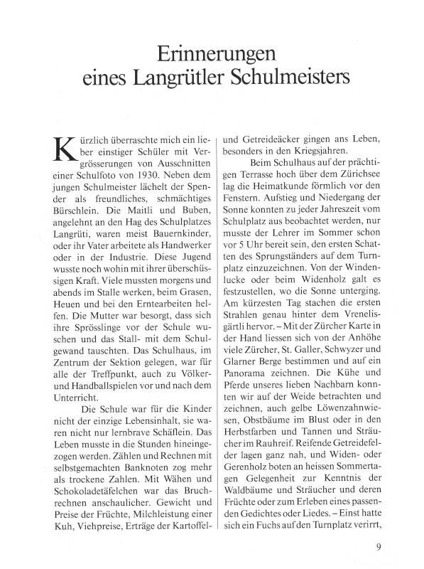 Das Langrütler Schulvölklein bot ein interessantes Gemisch. Neben den bekannten Seebuben- und Zürchernamen tauchten Geschlechter aus allen Innerschweizer Kantonen, aus der Ost- und Nordostschweiz und dem Bernbiet, dem Bündner Oberland und dem Puschlav auf. Da waren Bedächtige, Unternehmungslustige und Hitzige am gleichen Gespann mit Humor und Festigkeit zu zügeln. Reformierte und Katholiken konnten Toleranz üben, sie wussten um die Unterschiede, aber achteten sich gegenseitig.