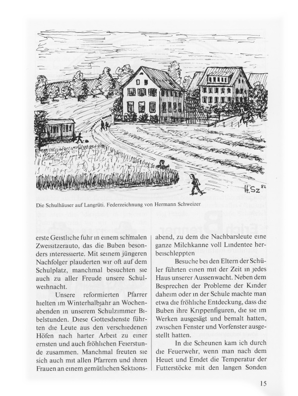 Oft fegten in harten Wintern die Schneestürme gewaltig um die Schulhäuser und verwehten die Langrütistrasse, dass tagelang keine Fahrzeuge hinaufkamen. Mein Kollege und ich mussten mehrmals mit den Skiern den kleinen Schülern den Heimweg spuren. Wie gerne kehrte man dann in die Geborgenheit des Schulhauses und der warmen Stube zurück und sah bei einer Tasse heissem Tee zu, wie draussen der Schnee die Scheiben vermauerte.