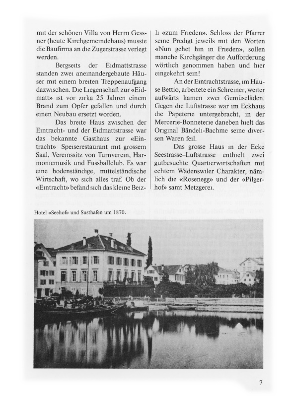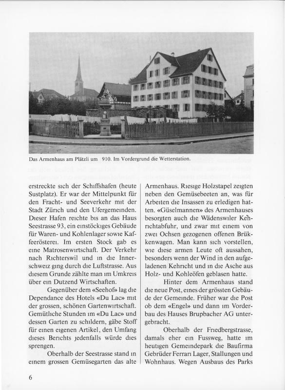 Hotel «Seehof», heute Sport-Bar. Zwischen dem «Seehof» und dem Sustplatz erstreckte sich der Schiffshafen (heute Sustplatz). Er war der Mittelpunkt für den Fracht- und Seeverkehr mit der Stadt Zürich und den Ufergemeinden. Dieser Hafen reichte bis an das Haus Seestrasse 93, ein einstöckiges Gebäude für Waren- und Kohlenlager sowie Kaffeerösterei. Im ersten Stock gab es eine Matrosenwirtschaft. Der Verkehr nach Richterswil und in die Innerschweiz ging durch die Luftstrasse. Aus diesem Grunde zählte man im Umkreis über ein Dutzend Wirtschaften.