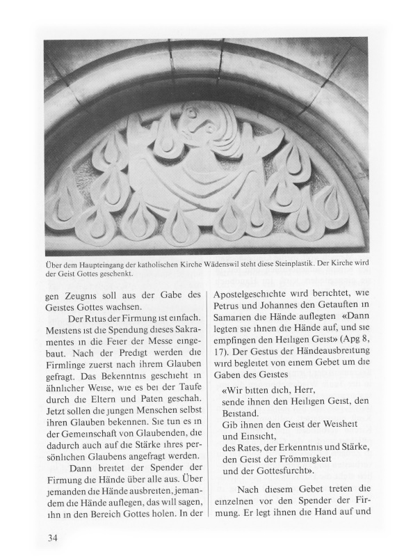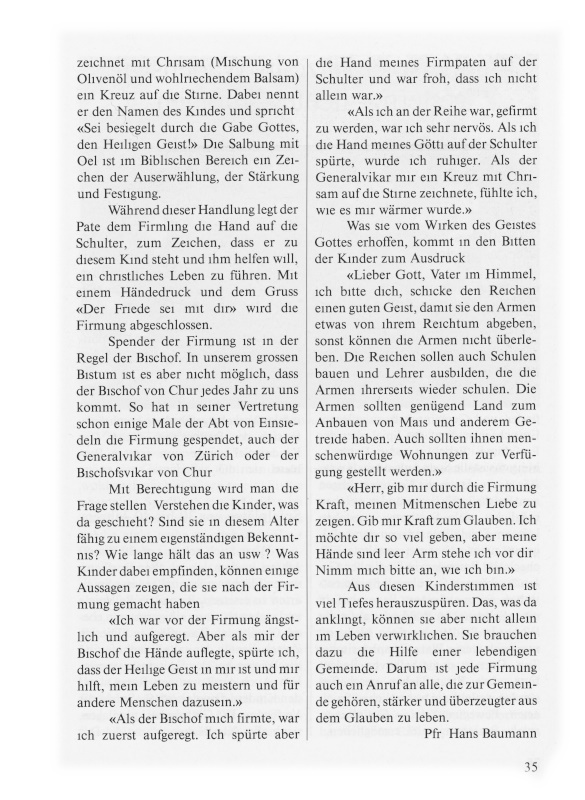 «Als ich an der Reihe war, gefirmt zu werden, war ich sehr nervös. Als ich die Hand meines Götti auf der Schulter spürte, wurde ich ruhiger. Als der Generalvikar mir ein Kreuz mit Chrisam auf die Stirne zeichnete, fühlte ich, wie es mir wärmer wurde.»