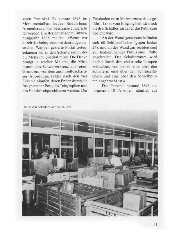 An der Wand geradeaus befinden sich 60 Schlüsselfächer (gegen bisher 24), und an der Wand zur rechten sind zur Bedienung des Publikums Pulte angebracht. Der Schalterraum wird nachts durch drei elektrische Lampen erleuchtet, von denen eine über den Schaltern, eine über den Schlüsselfächern und eine über den Schreibpulten angebracht ist.»