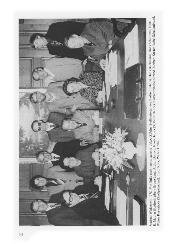 Emil Bader entworfene, mustergültige Gemeindeordnung in Kraft, und der neu gewählte Stadtrat versammelte sich zu seiner ersten konstituierenden Sitzung. Ihm gehörten an: Stadtpräsident Walter Rusterholz (FDP), Rudolf Billeter (SP), Hans Buchmann (FDP), Arthur Dohner (EVP), Walter Höhn (SVP), Norbert Kuster (CVP), Trudi Rota (CVP), Isabel Schaltenbrand (FDP) und Ernst Stocker (SVP).