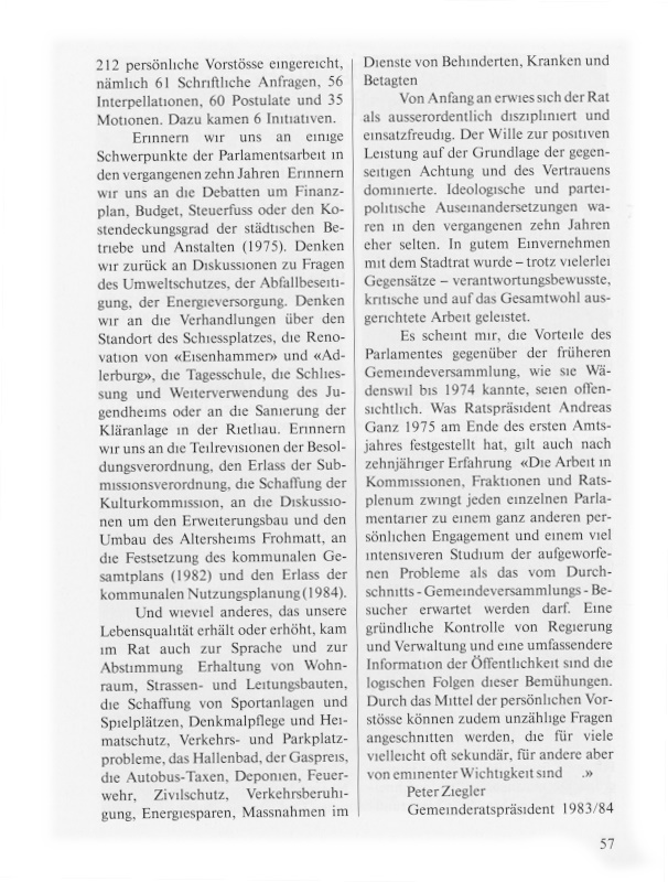 Erinnern wir uns an einige Schwerpunkte der Parlamentsarbeit in den vergangen zehn Jahren! Erinnern wir uns an die Debatten um Finanzplan, Budget, Steuerfuss oder den Kostendeckungsgrad der städtischen Betriebe und Anstalten (1975). Denken wir zurück an Diskussionen zu Fragen des Umweltschutzes, der Abfallbeseitigung, der Energieversorgung. Denken wir an die Verhandlungen über den Standort des Schiessplatzes, die Renovation des «Eisenhammer» und «Adlerburg», die Tagesschule, die Schliessung und Weiterverwendung des Jugendheims oder an die Sanierung der Kläranlage in der Rietliau. Erinnern wir uns an die Teilrevision der Besoldungsverordnung, die Schaffung der Kulturkommission, an die Diskussionen um den Erweiterungsbau und den Umbau des Altersheims Frohmatt, an die Festsetzung des kommunalen Gesamtplans (1982) und den Erlass der kommunalen Nutzungsplanung (1984). Und wieviel anderes, das unsere Lebensqualität erhält oder erhöht, kam im Rat auch zur Sprache und zur Abstimmung: Erhaltung von Wohnraum, Strassen- und Leitungsbauten, die Schaffung von Sportanlagen und Spielplätzen, Denkmalpflege und Heimatschutz, Verkehrs- und Parkplatzprobleme, das Hallenbad, der Gaspreis, die Autobus-Taxen, Deponien, Feuerwehr, Zivilschutz, Verkehrsberuhigung, Energiesparen, Massnahmen im Dienste von Behinderten, Kranken und Betagten …