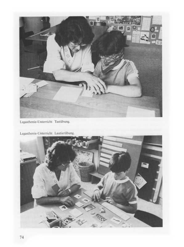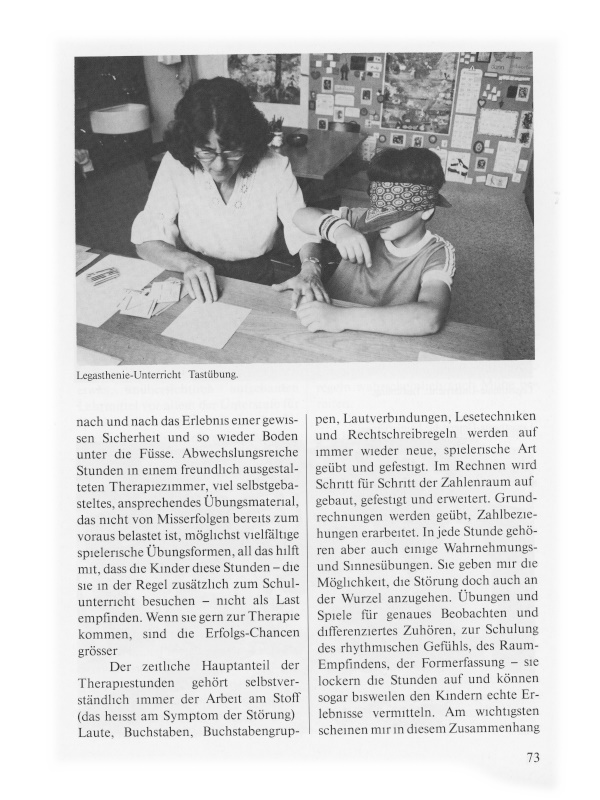 Der zeitliche Hauptanteil der Therapiestunden gehört selbstverständlich immer der Arbeit am Stoff (das heisst am Symptom der Störung): Laute, Buchstaben, Buchstabengruppen, Lautverbindungen, Lesetechniker und Rechtschreibregeln werden auf immer wieder neue, spielerische Art geübt und gefestigt. Im Rechnen wird Schritt für Schritt der Zahlenraum aufgebaut, gefestigt und erweitert. Grundrechnungen werden geübt, Zahlbeziehungen erarbeitet. In jede Stunde gehören aber auch einige Wahrnehmungs- und Sinnesübungen. Sie geben mir dir Möglichkeit, die Störung doch auch an der Wurzel anzugehen. Übungen und Spiele für genaues Beobachten und differenziertes Zuhören, zur Schulung des rhythmischen Gefühls, des Raum Empfindens, der Formerfassung − sie lockern die Stunden auf und können sogar bisweilen den Kindern echte Erlebnisse vermitteln. Am wichtigster scheinen mir in diesem Zusammenhang die Übungen für den Tastsinn. «Ist es möglich, dass es so vielerlei Blätter gibt auf der Welt!» ruft ein Kind erstaunt aus, das zum ersten Mal in seinem Leben die harte Glätte eines Rosenblattes, die pelzige Weichheit der Zimmerlinde mit den Fingern tastend erfahren hat. Die kühle Schwere eines Bachkiesels, die Feinheit und Wärme eines geschliffenen Holzstücks zum Beispiel − das sind für viele unserer «Fernsehkinder» neue Sinnes-Erfahrungen, die ihnen ein ganz klein wenig helfen sollen, die Welt zu begreifen.