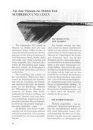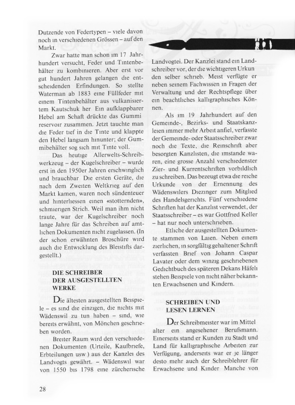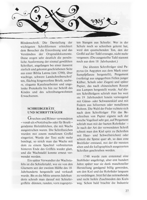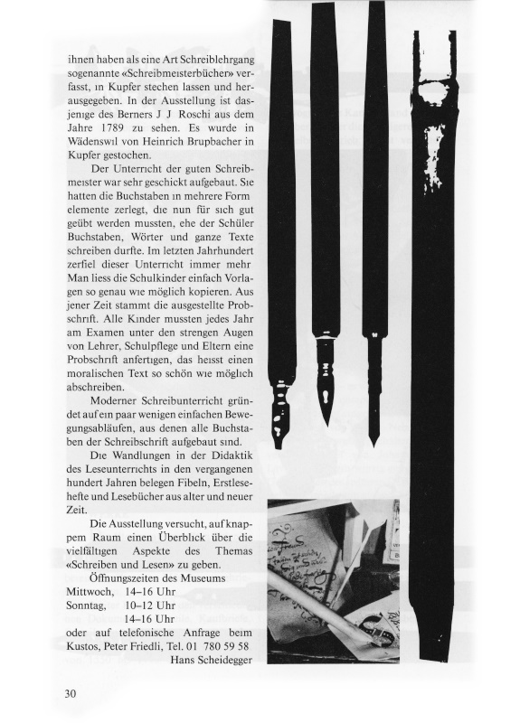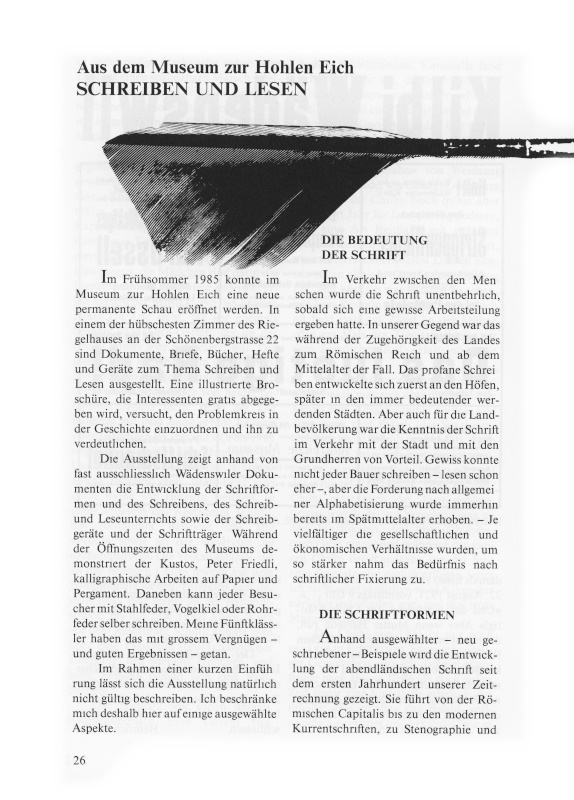 Museum zur Hohlen Eich eine neue permanente Schau eröffnet werden. In einem der hübschesten Zimmer des Riegelhauses an der Schönenbergstrasse 22 sind Dokumente, Briefe, Bücher, Hefte und Geräte zum Thema Schreiben und Lesen ausgestellt. Eine illustrierte Broschüre, die Interessenten gratis abgegeben wird, versucht, den Problemkreis in der Geschichte einzuordnen und ihn zu verdeutlichen.