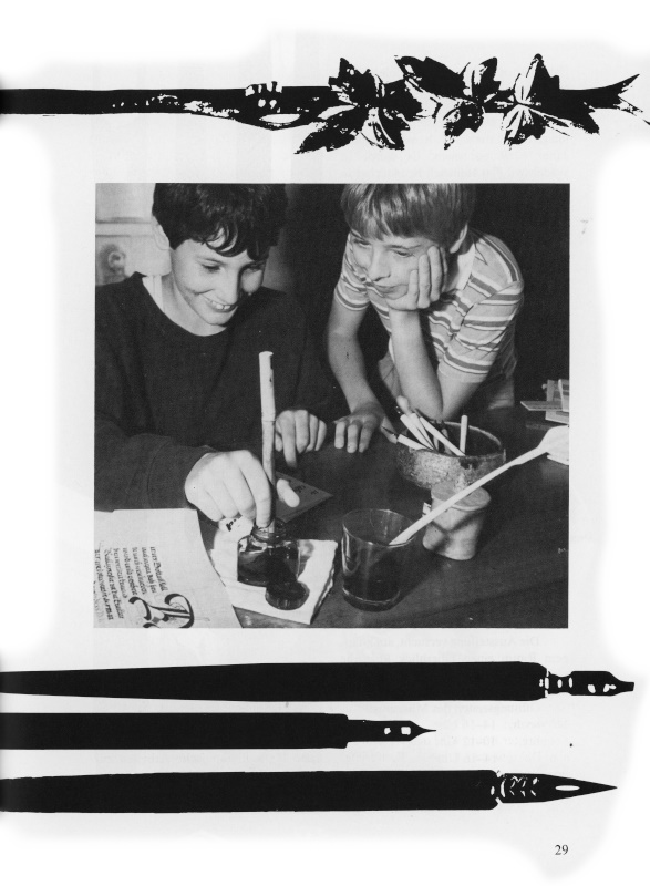 Die Ausstellung zeigt anhand vor fast ausschliesslich Wädenswiler Dokumenten die Entwicklung der Schriftformen und des Schreibens, des Schreib- und Leseunterrichts sowie der Schreibgeräte und der Schriftträger. Während der Öffnungszeiten des Museums demonstriert der Kustos, Peter Friedli, kalligraphische Arbeiten auf Papier um Pergament. Daneben kann jeder Besucher mit Stahlfeder, Vogelkiel oder Rohrfeder selber schreiben. Meine Fünftklässler haben das mit grossem Vergnügen und guten Ergebnissen getan.