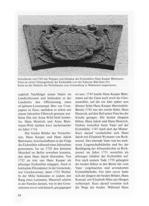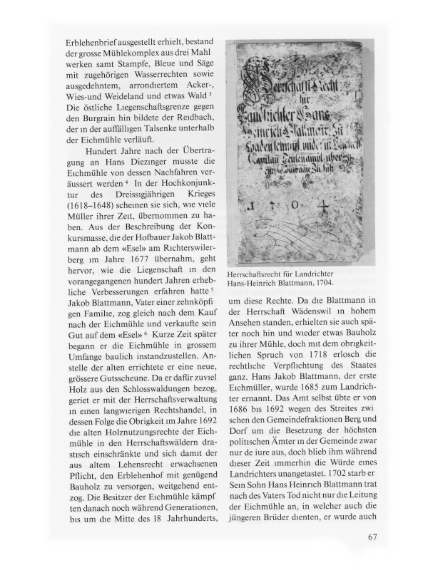 Da er dafür zuviel Holz aus den Schlosswaldungen bezog, geriet er mit der Herrschaftsverwaltung in einen langwierigen Rechtshandel, in dessen Folge die Obrigkeit im Jahre 1692 die alten Holznutzungsrechte der Eichmühle in den Herrschaftswäldern drastisch einschränkte und sich damit der aus altem Lehensrecht erwachsenen Pflicht, den Erblehenhof mit genügend Bauholz zu versorgen, weitgehend entzog. Die Besitzer der Eichmühle kämpften danach noch während Generationen, bis um die Mitte des 18. Jahrhunderts, um diese Rechte. Da die Blattmann in der Herrschaft Wädenswil in hohem Ansehen standen, erhielten sie auch später noch hin und wieder etwas Bauholz zu ihrer Mühle, doch mit dem obrigkeitlichen Spruch von 1718 erlosch die rechtliche Verpflichtung des Staates ganz. Hans Jakob Blattmann, der erste Eichmüller, wurde 1685 zum Landrichter ernannt. Das Amt selbst übte er von 1686 bis 1692 wegen des Streites zwischen den Gemeindefraktionen Berg und Dorf um die Besetzung der höchsten politischen Ämter in der Gemeinde zwar nur de iure aus, doch blieb ihm während dieser Zeit immerhin die Würde eines Landrichters unangetastet. 1702 starb er. Sein Sohn Hans Heinrich Blattmann trat nach des Vaters Tod nicht nur die Leitung der Eichmühle an, in welcher auch die jüngeren Brüder dienten, er wurde auch sogleich Nachfolger seines Vaters im Landrichteramt und bekleidete in der Landmiliz den Offiziersrang eines «Capitann-Leutenampt über ein Compagnie zu fuss», nachdem er schon seit einem Jahrzehnt Fähnrich gewesen war. Seine Ehe mit Anna Wild blieb kinderlos. Hans Heinrich und Anna Blattmann-Wild starben kurz nacheinander im Jahre 1716.
