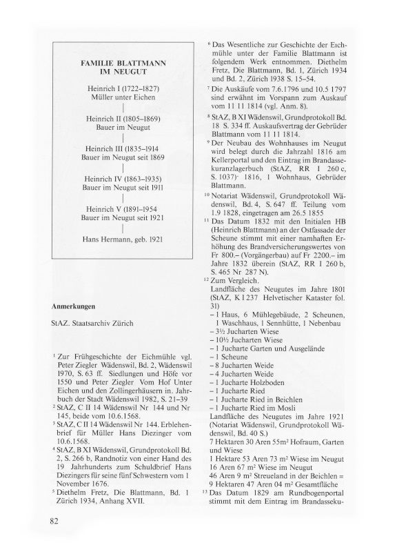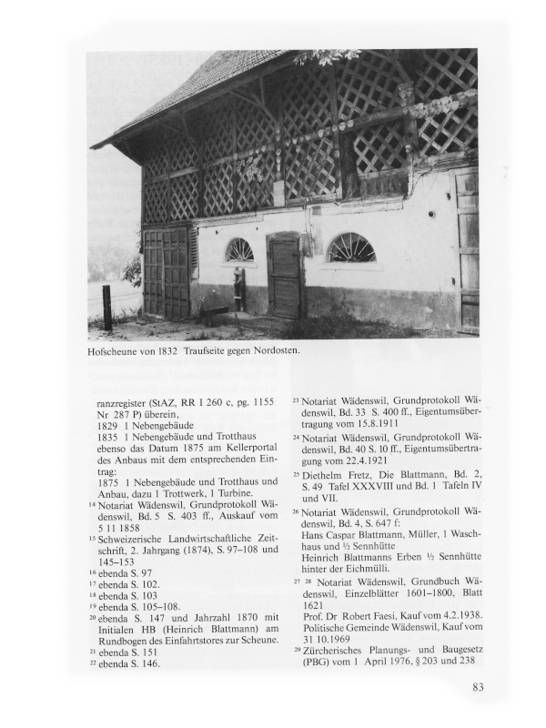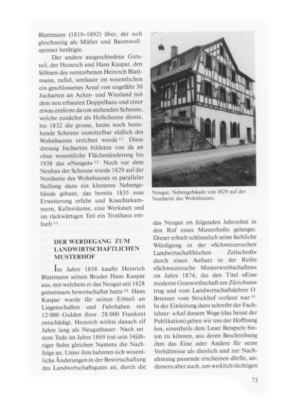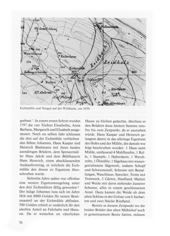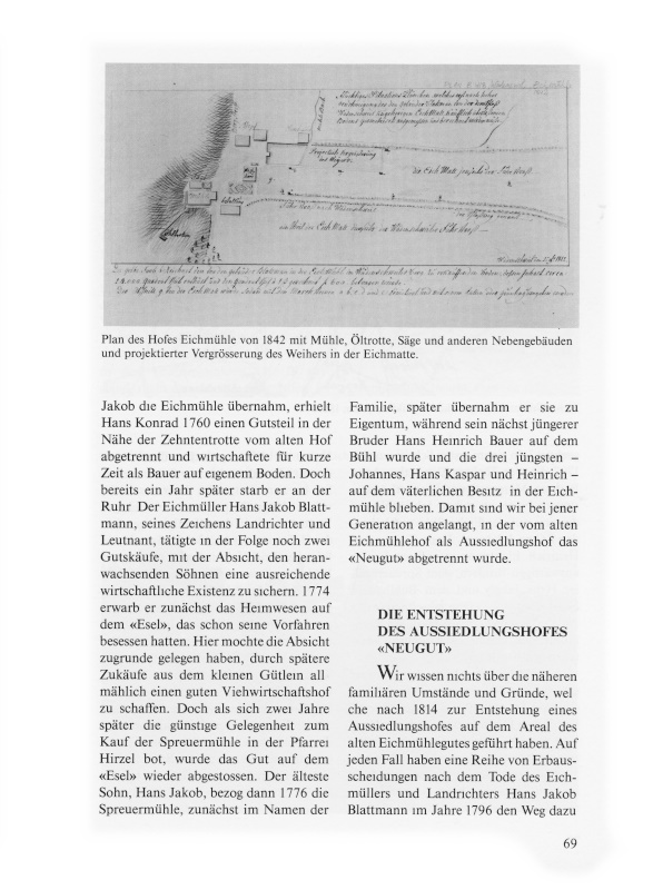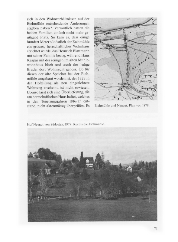 Bereits in diesem Zeitpunkt wo die beiden Brüder den alten Mühlehof noch in gemeinsamem Besitz hatten, müssen sich in den Wohnverhältnissen auf der Eichmühle entscheidende Änderungen ergeben haben9. Vermutlich hatten die beiden Familien einfach nicht mehr genügend Platz. So kam es, dass einige hundert Meter südöstlich der Eichmühle ein grosses, herrschaftliches Wohnhaus errichtet wurde, das Heinrich Blattmann mit seiner Familie bezog, während Hans Kaspar mit der seinigen im alten Mühlewohnhaus blieb und auch der ledige Bruder dort Wohnrecht genoss. Ob für diesen der alte Speicher bei der Eichmühle umgebaut worden ist, der 1828 in der Hofteilung als neu eingerichtete Wohnung erscheint, ist nicht erwiesen. Ebenso lässt sich eine Überlieferung, die am herrschaftlichen Haus haftet, welches in den Teuerungsjahren 1816/17 entstand, nicht aktenmässig überprüfen.