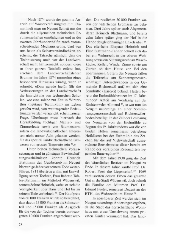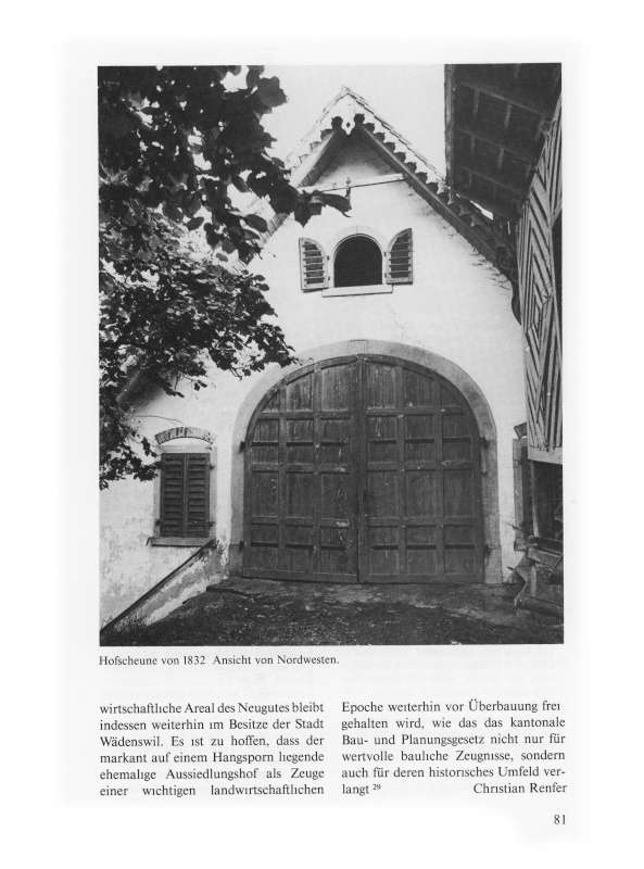 Das landwirtschaftliche Areal des Neugutes bleibt indessen weiterhin im Besitze der Stadt Wädenswil. Es ist zu hoffen, dass der markant auf einem Hangsporn liegende ehemalige Aussiedlungshof als Zeuge einer wichtigen landwirtschaftlichen Epoche weiterhin vor Überbauung freigehalten wird, wie das das kantonale Bau- und Planungsgesetz nicht nur für wertvolle bauliche Zeugnisse, sondern auch für deren historisches Umfeld verlangt29.