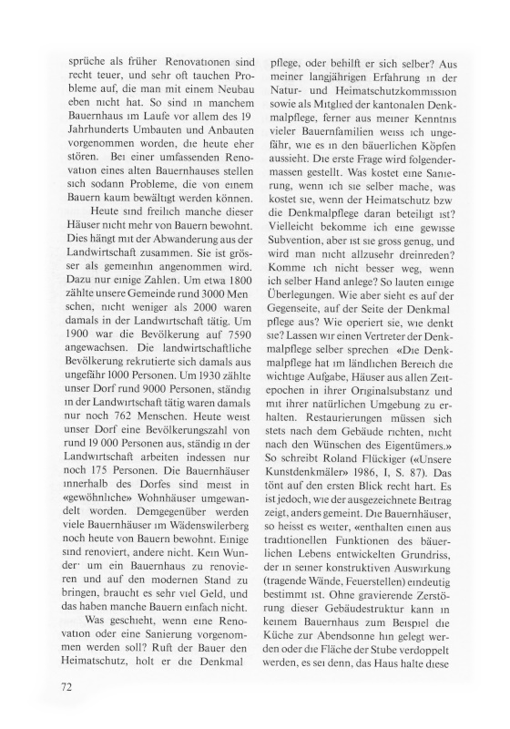 Wie aber sieht es auf der Gegenseite, auf der Seite der Denkmalpflege aus? Wie operiert sie, wie denkt sie? Lassen wir einen Vertreter der Denkmalpflege selber sprechen: «Die Denkmalpflege hat im ländlichen Bereich die wichtige Aufgabe, Häuser aus allen Zeitepochen in ihrer Originalsubstanz und mit ihrer natürlichen Umgebung zu erhalten. Restaurierungen müssen sich stets nach dem Gebäude richten, nicht nach den Wünschen des Eigentümers.» So schreibt Roland Flückiger («Unsere Kunstdenkmäler» 1986, I, S. 87). Das tönt auf den ersten Blick recht hart. Es ist jedoch, wie der ausgezeichnete Beitrag zeigt, anders gemeint. Die Bauernhäuser, so heisst es weiter, «enthalten einen aus traditionellen Funktionen des bäuerlichen Lebens entwickelten Grundriss, der in seiner konstruktiven Auswirkung (tragende Wände, Feuerstellen) eindeutig bestimmt ist. Ohne gravierende Zerstörung dieser Gebäudestruktur kann in keinem Bauernhaus zum Beispiel die Küche zur Abendsonne hin gelegt werden oder die Fläche der Stube verdoppelt werden, es sei denn, das Haus halte diese Lösung schon bereit», Dies ist zweifellos richtig. Ob das die Bauern aber immer verstehen? Die Schwierigkeit fängt schon im Detail an. Ja hier, im Detail, sitzt oft er Teufel, manchmal auch nur der Wurm.