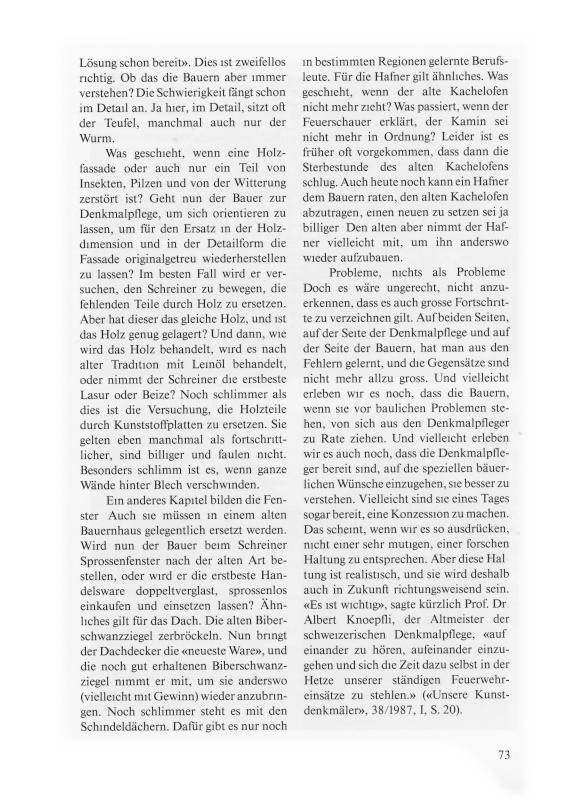 Probleme, nichts als Probleme! Doch es wäre ungerecht, nicht anzuerkennen, dass es auch grosse Fortschritte zu verzeichnen gilt. Auf beiden Seiten, auf der Seite der Denkmalpflege und auf der Seite der Bauern, hat man aus den Fehlern gelernt, und die Gegensätze sind nicht mehr allzu gross. Und vielleicht erleben wir es noch, dass die Bauern, wenn sie vor baulichen Problemen stehen, von sich aus den Denkmalpfleger zu Rate ziehen. Und vielleicht erleben wir es auch noch, dass die Denkmalpfleger bereit sind, auf die speziellen bäuerlichen Wünsche einzugehen, sie besser zu verstehen. Vielleicht sind sie eines Tages sogar bereit, eine Konzession zu machen. Das scheint, wenn wir es so ausdrücken, nicht einer sehr mutigen, einer forschen Haltung zu entsprechen. Aber diese Haltung ist realistisch, und sie wird deshalb auch in Zukunft richtungsweisend sein. «Es ist wichtig», sagte kürzlich Prof. Dr. Albert Knoepfli, der Altmeister der schweizerischen Denkmalpflege, «aufeinander zu hören, aufeinander einzugehen und sich die Zeit dazu selbst in der Hetze unserer ständigen Feuerwehreinsätze zu stehlen.» («Unsere Kunstdenkmäler», 38/1987, I, S. 20).