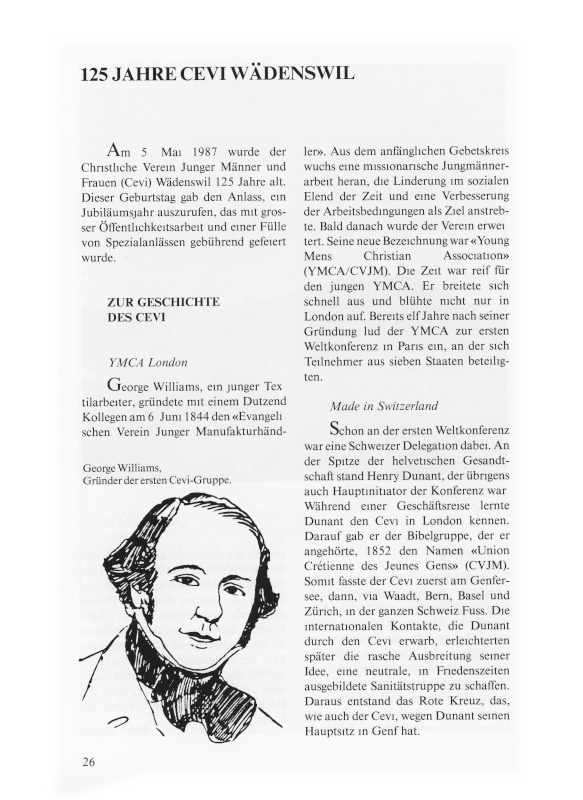 Am 5. Mai 1987 wurde der Christliche Verein Junger Männer und Frauen (Cevi) Wädenswil 125 Jahre alt. Dieser Geburtstag gab den Anlass, ein Jubiläumsjahr auszurufen, das mit grosser Öffentlichkeitsarbeit und einer Fülle von Spezialanlässen gebührend gefeiert wurde.