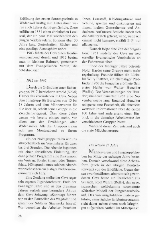 Durch die Gründung einer Bubengruppe, 1917, bereicherte Arnold (Noldi) Harder das Vereinsleben im Cevi. Neben dem Jungtrupp für Burschen von 13 bis 18 Jahren und dem Männerverein für alle über 18, schritt seine Gruppe in die Zwischenkriegszeit. Über diese Jahre wissen wir bereits etwas mehr, vor allem aus den Erzählungen alter Wädenswiler. Alle Gruppen trafen sich am Montagabend zu ihrem Programm. «In der Noldigruppe trafen wir uns allwöchentlichen im Vereinshaus für zwei bis drei Stunden. Die Abende begannen mit einer christlichen Einleitung, der dann je nach Programm eine Diskussion, ein Vortrag, Spiele, Singen oder Turnen folgte. Höhepunkt eines solchen Abends war nicht selten ein lustiges Nidelessen», erinnerte sich H. S. Eine Zeitlang stellte der Cevi sogar sein eigenes Jugendorchester. Ende der zwanziger Jahre und in den dreissiger Jahren verlieh eine besondere Aktion dem Cevi Schwung. «Sonntags fuhren wir zu den Baustellen des Wägitaler und später des Sihltaler Stauwerks hinauf. Wir besuchten die Arbeiter, brachten ihnen Lesestoff, Kleidungsstücke und Schuhe, spielten und diskutierten mit ihnen, hielten Gottesdienste und Andachten. Auf unsere Besuche haben sich die Arbeiter stets gefreut: wehe wenn wir einmal nicht kamen» erzählt E.F. nur allzugerne.