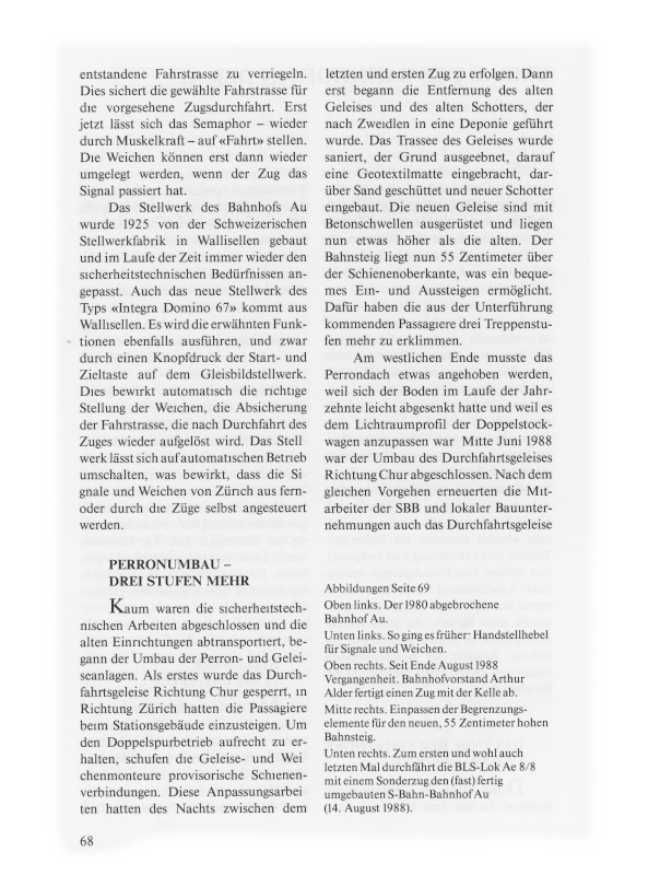 69d, e Oben: Einpassen der Begrenzungselemente für den neuen 55 Centimeter hohen Bahnsteig. Unten: Zum ersten und wohl auch letzten Mal durchfährt die BLS-Lok Ae 8/8 mit einem Sonderzug den (fast) fertig umgebauten S-Bahn-Bahnhof Au (14. August 1988).