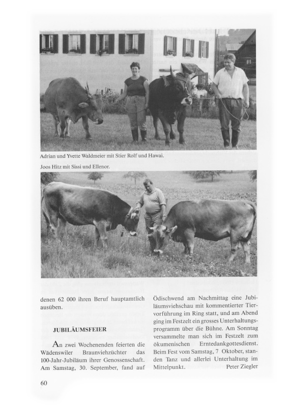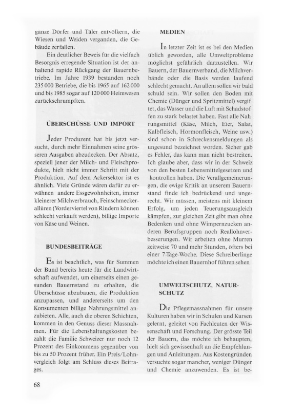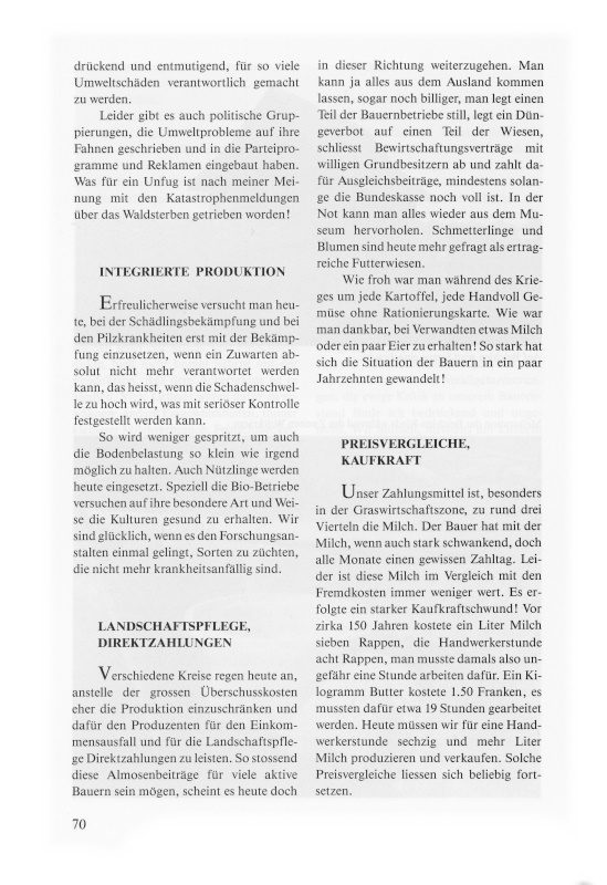 In letzter Zeit ist es bei den Medien üblich geworden, alle Umweltprobleme möglichst gefährlich darzustellen. Wir Bauern, der Bauernverband, die Milchverbände oder die Basis werden laufend schlecht gemacht. An allem sollen wir bald schuld sein. Wir sollen den Boden mit Chemie (Dünger und Spritzmittel) vergiftet, das Wasser und die Luft mit Schadstoffen zu stark belastet haben. Fast alle Nahrungsmittel (Käse, Milch, Eier, Salat, Kalbfleisch, Hormonfleisch, Weine usw.) sind schon in Schreckensmeldungen als ungesund bezeichnet worden. Sicher gab es Fehler, das kann man nicht bestreiten. Ich glaube aber, dass wir in der Schweiz von den besten Lebensmittelgesetzen und -kontrollen haben. Die Verallgemeinerungen, die ewige Kritik an unserem Bauernstand finde ich bedrückend und ungerecht. Wir müssen, meistens mit kleinem Erfolg, um jeden Teuerungsausgleich kämpfen; zur gleichen Zeit gibt man ohne Bedenken und ohne Wimpernzucken anderen Berufsgruppen noch Reallohnverbesserungen. Wir arbeiten ohne Murren zeitweise 70 und mehr Stunden, öfters bei einer 7-Tage-Woche. Diese Schreiberlinge möchte ich einen Bauernhof führen sehen!