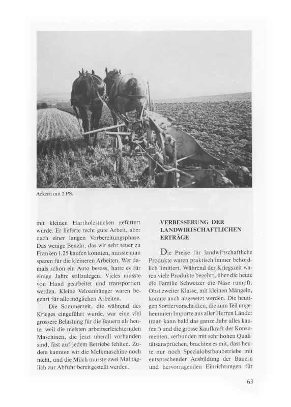 Die Preise für landwirtschaftliche Produkte waren praktisch immer behördlich limitiert. Während der Kriegszeit waren viele Produkte begehrt, über die heute die Familie Schweizer die Nase rümpft. Obst zweiter Klasse, mit kleinen Mängeln, konnte auch abgesetzt werden. Die heutigen Sortiervorschriften, die zum Teil ungehemmten Importe aus aller Herren Ländern (man kann bald das ganze Jahr alles kaufen!) und die grosse Kaufkraft der Konsumenten, verbunden mit sehr hohen Qualitätsansprüchen, brachten es mit, dass heute nur noch Spezialobstbaubetriebe mit entsprechender Ausbildung der Bauern und hervorragenden Einrichtungen für Pflege, Ernte und Lagerung mithalten können.