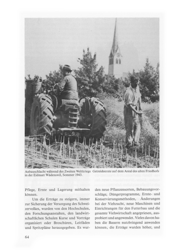 Die Lebensmittelzufuhren waren recht gestört, vom guten Willen unserer Nachbarstaaten abhängig, und die Behörden machten sich deshalb grosse Sorgen, wie das Schweizervolk überhaupt noch zu ernähren sei. Professor Traugott Wahlen, der Schöpfer des Anbauplanes, entwickelte das Programm zur Sicherung der Versorgung unseres Landes. Es waren dazu 500‘000 Hektaren Ackerfläche notwendig. In grossem Stil wurden Riede melioriert, Güterzusammenlegungen durchgeführt: mitfinanziert neben Beiträgen der Grundeigentümer durch Zahlungen der öffentlichen Hand, unter Leitung der kantonalen Landwirtschafts- und Meliorationsämter. Es wurden gemeinsame Maschinen angekauft, Pflanzwerke gegründet, mit Unterstützung von Gemeinden und Industriebetrieben. So besass zum Beispiel die Stadt Zürich in Ennetmoos NW ein grosses Pflanzwerk. Gärten, Pärke, Sportplätze, alte Friedhöfe (Wädenswil), jeder geeignete «Blätz» musste herhalten, um Kartoffeln, Getreide und Gemüse aller Art zu produzieren. Jeder Bauer erhielt die Verpflichtung, entsprechend seiner Grundfläche die berechnete Ackerfläche zu bebauen und die Produkte abzuliefern; er durfte für seine Versorgung natürlich etwas davon behalten. Ein raffiniertes System sorgte dafür, dass nicht gemogelt werden konnte (Ablieferung, Bezugsrecht für Saatgut, Dünger usw.)