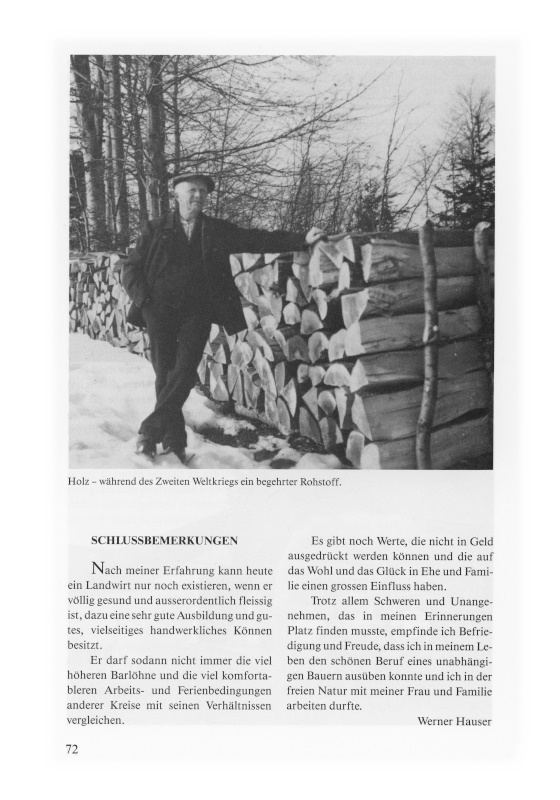 Trotz allem Schweren und Unangenehmen, das in meinen Erinnerungen Platz finden musste, empfinde ich Befriedigung und Freude, dass ich in meinem Leben den schönen Beruf eines unabhängigen Bauern ausüben konnte und ich in der freien Natur mit meiner Frau und Familie arbeiten durfte.