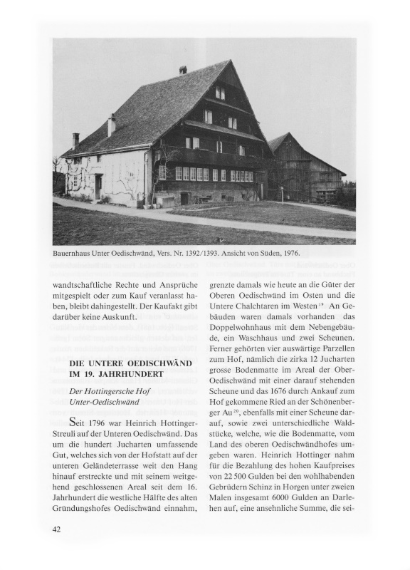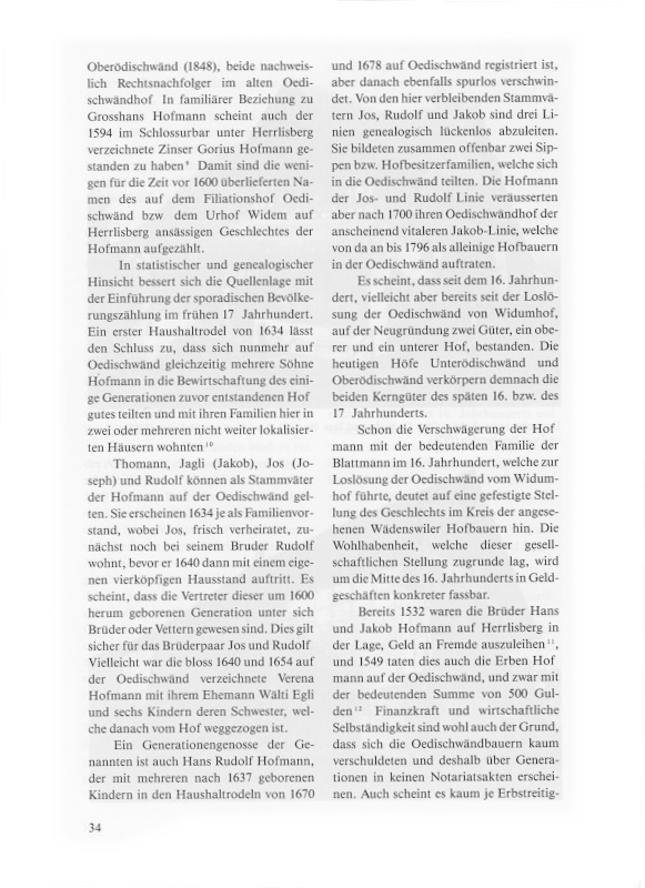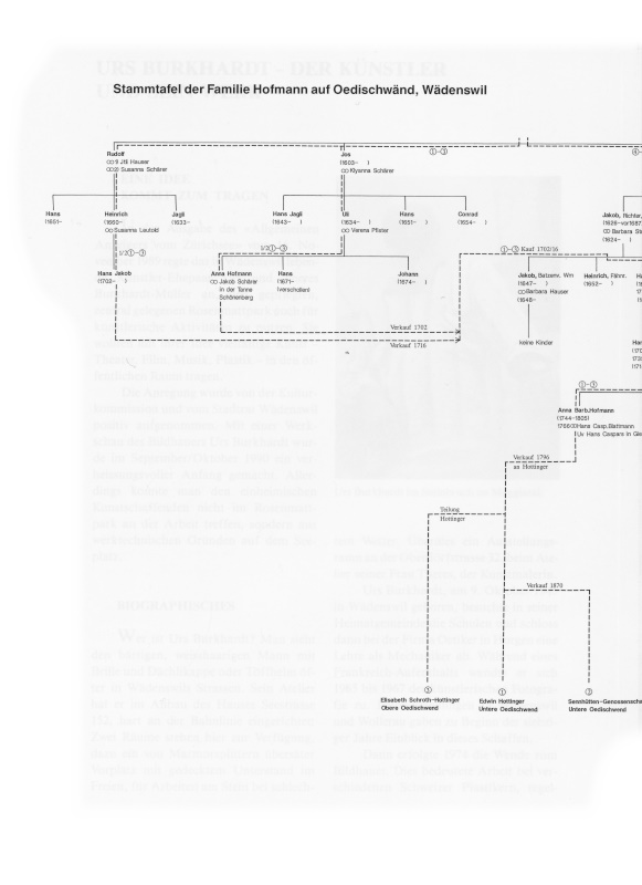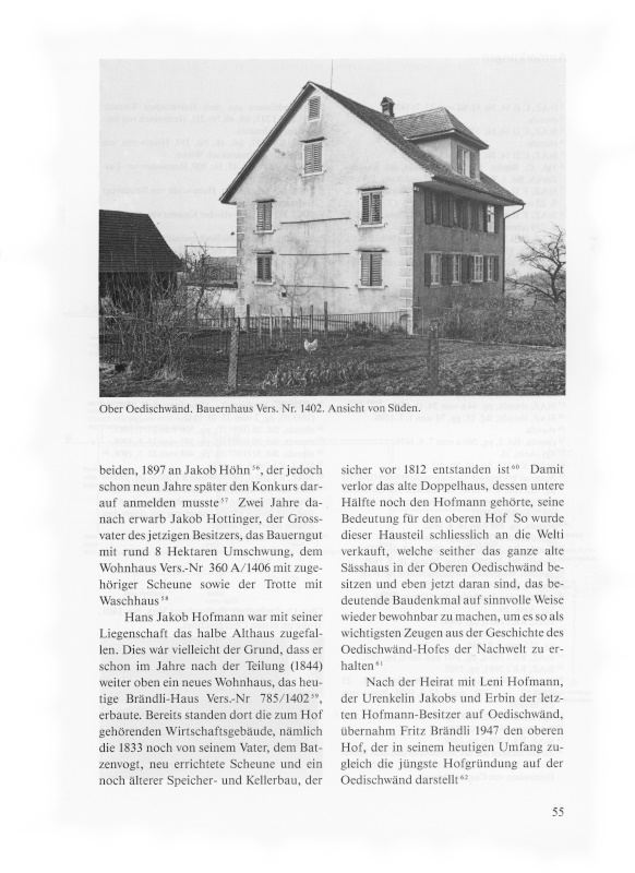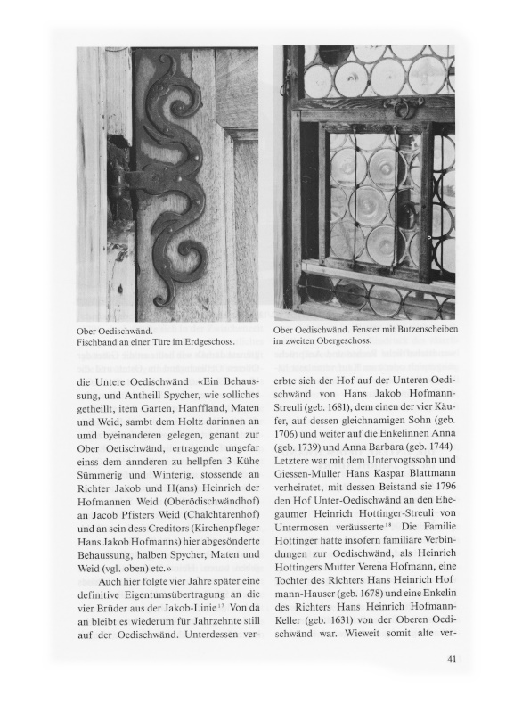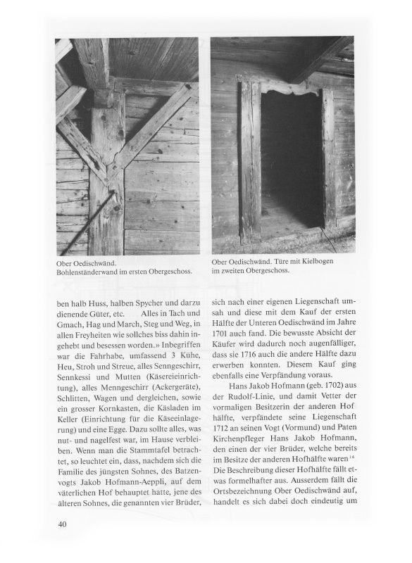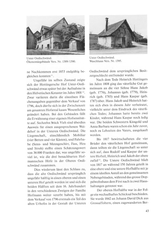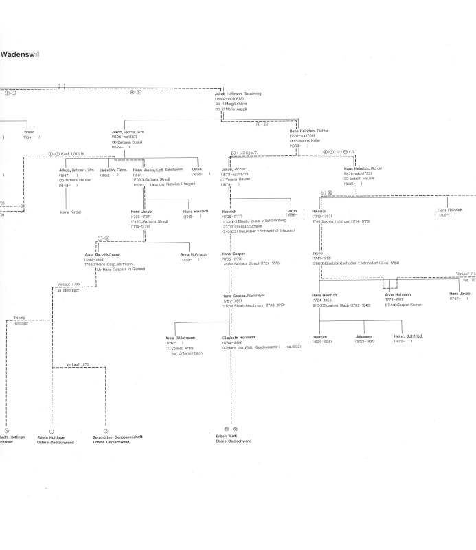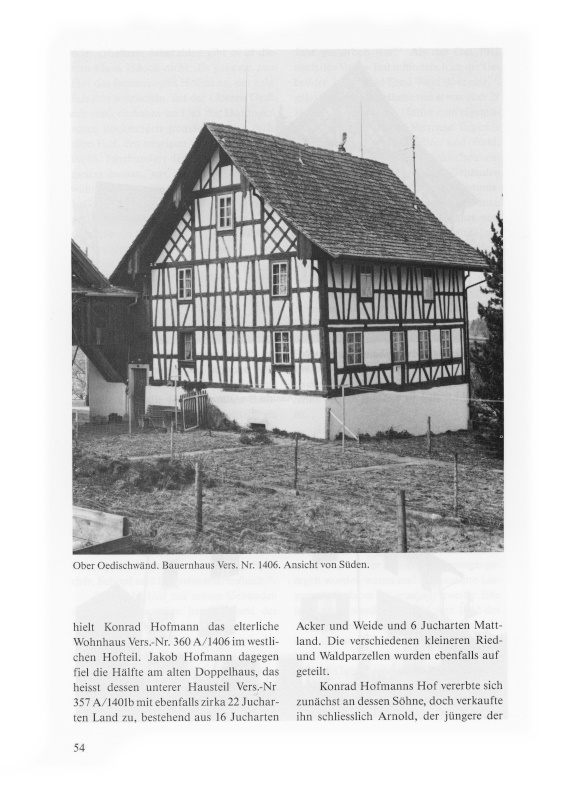 Zwanzig Jahre später sind im Schlossurbar von 1571 als Eigentümer einer stattlichen Wiese mit zugehörigem Heugaden (Feldscheune) im Umfang von fünf Kühen Winterung in der Oedischwänd Hans Stocker und dessen Ehefrau Margaretha Hofmann erwähnt, welchen 1595/96 Grosshans Hofmann als Zinser nachfolgte8. Die späteren Spuren dieses Zinses führen über Landrichter Heinrich Hofmanns Erben (1705) zu Landrichter und Schützenmeister Jakob Hofmann (1790) und weiter zu den Hottingern auf Unterödischwänd und den Welti auf Oberödischwänd (1848), beide nachweislich Rechtsnachfolger im alten Oedischwändhof. In familiärer Beziehung zu Grosshans Hofmann scheint auch der 1594 im Schlossurbar unter Herrlisberg verzeichnete Zinser Gorius Hofmann gestanden zu haben9. Damit sind die wenigen für die Zeit vor 1600 überlieferten Namen des auf dem Filiationshof Oedischwänd bzw. dem Urhof Widern auf Herrlisberg ansässigen Geschlechtes der Hofmann aufgezählt.