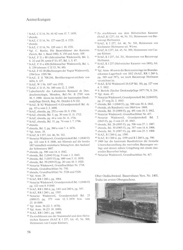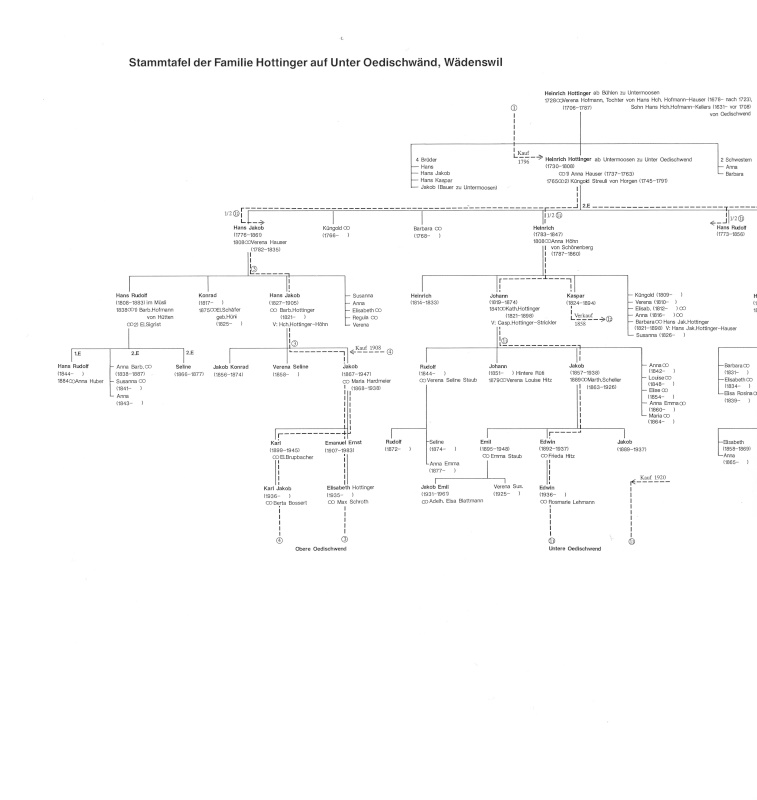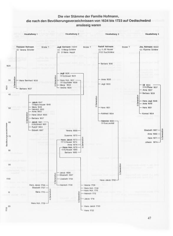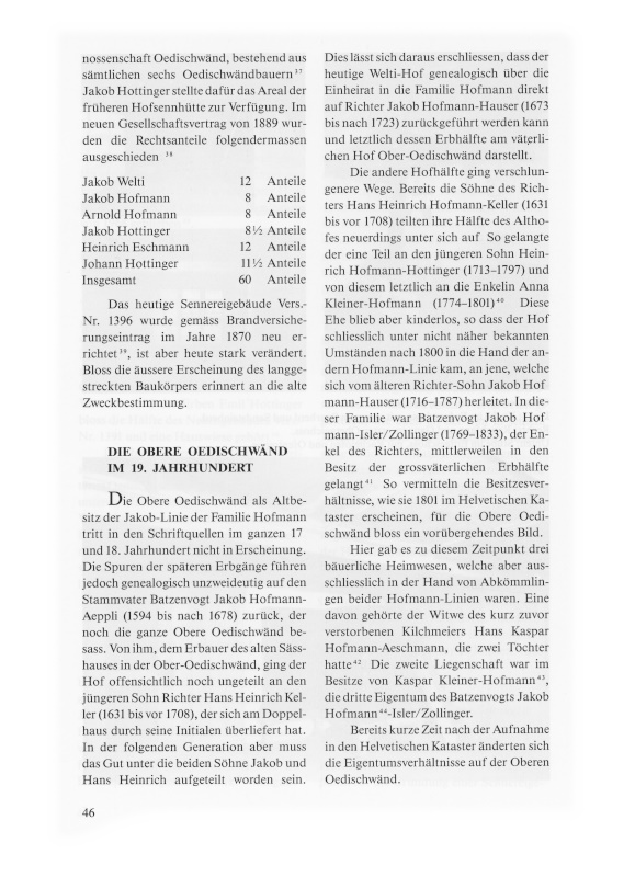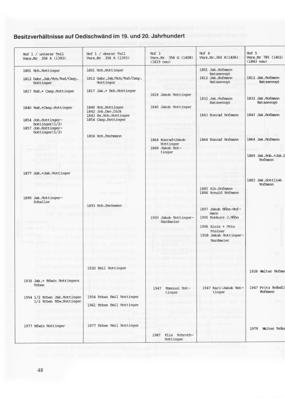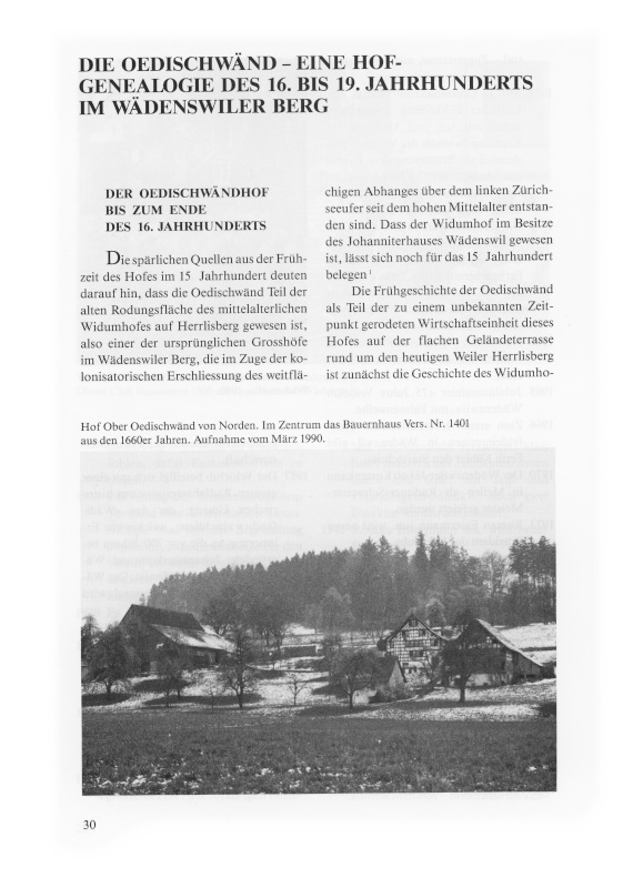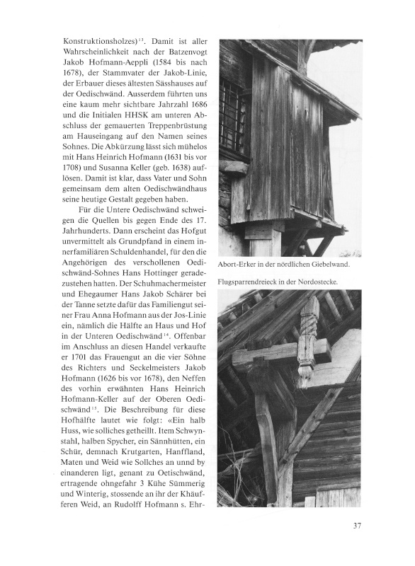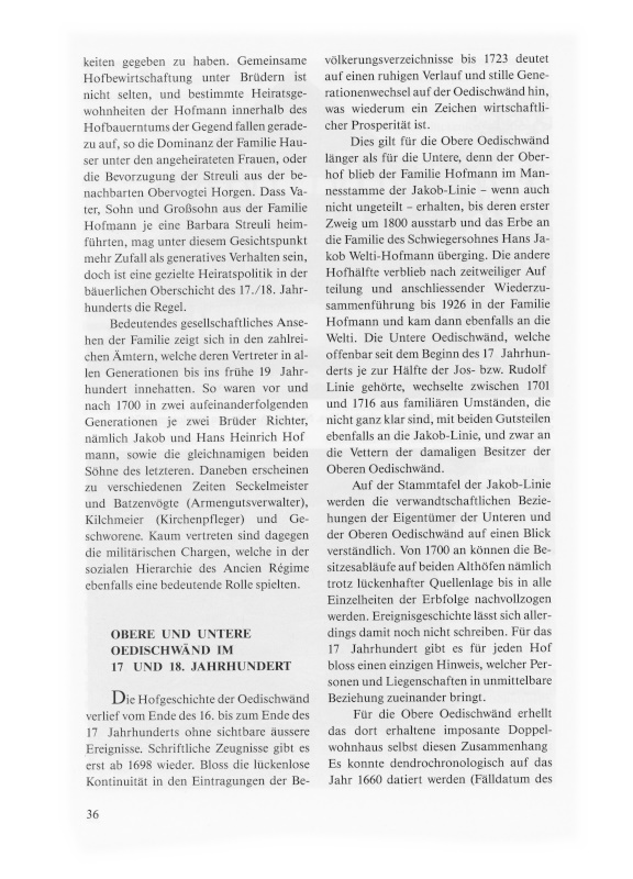 Zwanzig Jahre später sind im Schlossurbar von 1571 als Eigentümer einer stattlichen Wiese mit zugehörigem Heugaden (Feldscheune) im Umfang von fünf Kühen Winterung in der Oedischwänd Hans Stocker und dessen Ehefrau Margaretha Hofmann erwähnt, welchen 1595/96 Grosshans Hofmann als Zinser nachfolgte8. Die späteren Spuren dieses Zinses führen über Landrichter Heinrich Hofmanns Erben (1705) zu Landrichter und Schützenmeister Jakob Hofmann (1790) und weiter zu den Hottingern auf Unterödischwänd und den Welti auf Oberödischwänd (1848), beide nachweislich Rechtsnachfolger im alten Oedischwändhof. In familiärer Beziehung zu Grosshans Hofmann scheint auch der 1594 im Schlossurbar unter Herrlisberg verzeichnete Zinser Gorius Hofmann gestanden zu haben9. Damit sind die wenigen für die Zeit vor 1600 überlieferten Namen des auf dem Filiationshof Oedischwänd bzw. dem Urhof Widern auf Herrlisberg ansässigen Geschlechtes der Hofmann aufgezählt.