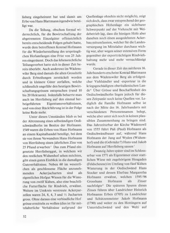 1549 waren die Erben von Hans Hofmann an einem Kapitalhandel beteiligt, bei dem sie von ihrem Verwandten Hans Hofmann von Herrlisberg einen jährlichen Zins von 25 Pfund erwarben5. Das zum Pfand eingesetzte Herrlisberggut, in welchem wir den restlichen Widumhof sehen möchten, gibt einen guten Einblick in die damaligen Gutsverhältnisse. Neben 60 im wesentlichen als geschlossene Fläche anzunehmenden Ackerjucharten sind als eigentliches Hofgut Wiesen für die Winterung von zwölf Kühen, also eine beachtliche Futterfläche für Rindvieh, erwähnt. Weitere im Umkreis verstreute Ackerparzellen waren 24, 8, 4, 3 und ½ Jucharten gross. Ohne daraus eine verbindliche Hofgrösse ermitteln zu wollen (dies ist für mittelalterliche Verhältnisse aufgrund der Quellenlage ohnehin nicht möglich), zeigt sich doch, dass zwar entsprechend der geographischen Höhenlage ein sichtbarer Schwerpunkt auf der Viehzucht mit Weidebetrieb lag, dass die hiesigen Höfe aber daneben noch einen ausgedehnten Ackerbau mitumfassten, welcher für die Landesversorgung im Mittelalter durchaus wichtig war, aber wegen seiner extensiven Form gegenüber der exportträchtigen Rindviehhaltung mehr und mehr vernachlässigt wurde.