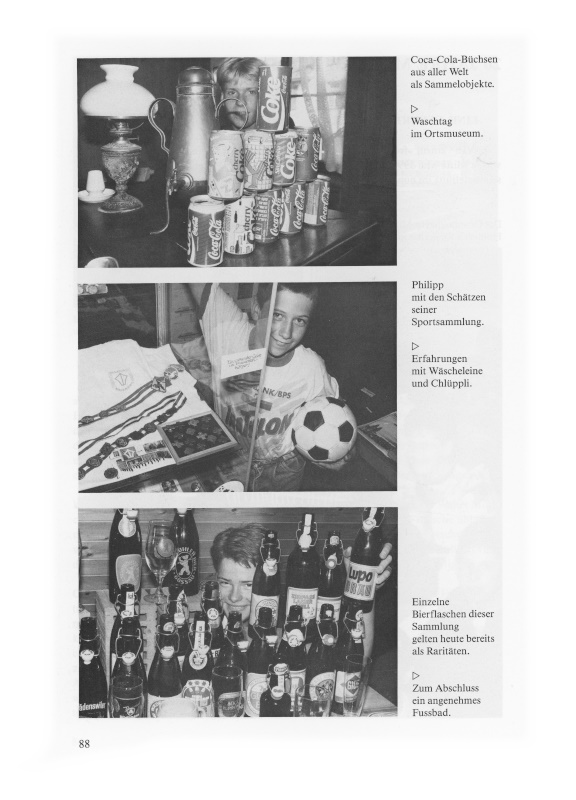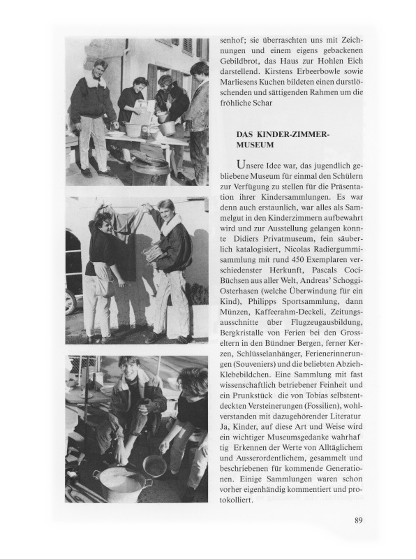 Unsere Idee war, das jugendlich gebliebene Museum für einmal den Schülern zur Verfügung zu stellen für die Präsentation ihrer Kindersammlungen. Es war denn auch erstaunlich, war alles als Sammelgut in den Kinderzimmern aufbewahrt wird und zur Ausstellung gelangen konnte: Didiers Privatmuseum, fein säuberlich katalogisiert, Nicolas Radiergummisammlung mit rund 450 Exemplaren verschiedenster Herkunft, Pascals Coci-Büchsen aus aller Welt, Andreas' Schoggi-Osterhasen (welche Überwindung für ein Kind), Philipps Sportsammlung, dann Münzen, Kaffeerahm-Deckeli, Zeitungsausschnitte über Flugzeugausbildung, Bergkristalle von Ferien bei den Grosseltern in den Bündner Bergen, ferner Kerzen, Schlüsselanhänger, Ferienerinnerungen (Souveniers) und die beliebten Abzieh-Klebebildehen. Eine Sammlung mit fast wissenschaftlich betriebener Feinheit und ein Prunkstück: die von Tobias selbstentdeckten Versteinerungen (Fossilien), wohlverstanden mit dazugehörender Literatur. Ja, Kinder, auf diese Art und Weise wird ein wichtiger Museumsgedanke wahrhaftig: Erkennen der Werte von Alltäglichem und Ausserordentlichem, gesammelt und beschriebenen für kommende Generationen. Einige Sammlungen waren schon vorher eigenhändig kommentiert und protokolliert.