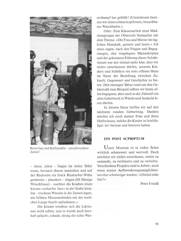 Oder: Eine Klassenarbeit einer Mädchengruppe der Oberstufe Steinacher mit dem Thema: «Die Frau und Mutter im täglichen Haushalt, gestern und heute.» Ich muss sagen, nach den Fragen und Begegnungen, den vorgelegten Manuskripten und der gekonnten Führung dieser Schülerinnen war mir einmal mehr klar, dass wir nichts unterlassen dürfen, unseren Kindern und Schülern ein stets offenes Haus im Sinne der Beziehung zwischen Zukunft, Gegenwart und Geschichte zu bieten. Den einstigen Tabus rund um den Gebärstuhl zum Beispiel sollten wir heute offen begegnen, aber auch in der Zukunft ein altes Gebetbuch in Würde und Andacht lesen dürfen.