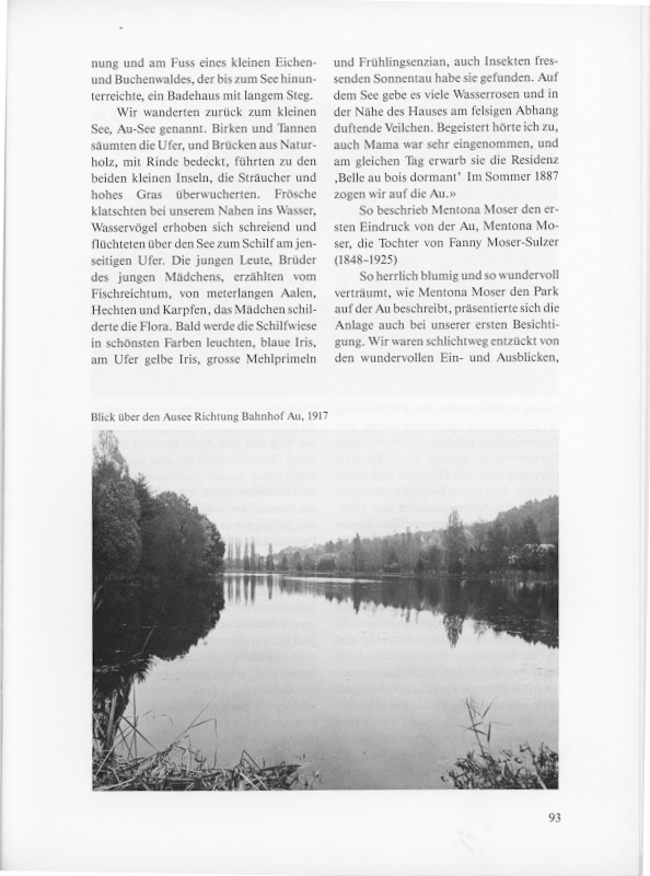 Nach dem Haus besichtigten wir das Gut. Es nahm ungefähr die Hälfte der Halbinsel ein. Da war ein Pächterhaus mit Kuhstall, ein Pferdestall mit Kutscherwohnung und am Fuss eines kleinen Eichen- und Buchenwaldes, der bis zum See hinunterreichte, ein Badehaus mit langem Steg. Wir wanderten zurück zum kleinen See, Au-See genannt. Birken und Tannen säumten die Ufer, und Brücken aus Naturholz, mit Rinde bedeckt, führten zu den beiden kleinen Inseln, die Sträucher und hohes Gras überwucherten. Frösche klatschten bei unserem Nahen ins Wasser, Wasservögel erhoben sich schreiend und flüchteten über den See zum Schilf am jenseitigen Ufer. Die jungen Leute, Brüder des jungen Mädchens, erzählten vom Fischreichtum, von meterlangen Aalen, Hechten und Karpfen; das Mädchen schilderte die Flora. Bald werde die Schilfwiese in schönsten Farben leuchten, blaue Iris, am Ufer gelbe Iris, grosse Mehlprimeln und Frühlingsenzian, auch Insekten fressenden Sonnentau habe ich gefunden. Auf dem See gebe es viele Wasserrosen und in der Nähe des Hauses am felsigen Abhang duftende Veilchen. Begeistert hörte ich zu, auch Mama war sehr eingenommen, und am gleichen Tag erwarb sie die Residenz «Belle au bois dormant». Im Sommer 1887 zogen wir auf die Au.
