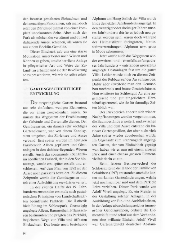 Beim letzten Besitzerwechsel des Schossgutes in die Hände der Familie von Schulthess (1917) entstanden auch die letzten markanten Gartenänderungen, welche jetzt noch sichtbar sind und dem Park die Reize verleihen. Dieser Park wurde von Adolf Vivell angelegt. Er, ein Meister in der Gestaltung solcher Anlagen, in der Ausbildung von Ein- und Ausblickachsen, in der Anlage abwechslungsreicher immergrüner Gehölzgruppen, ordnete die Elementvielfalt und schuf aus dem Vorhandenen eine brillante Einheit. Adolf Vivell war Gartenarchitekt deutscher Abstammung. Er lebte von 1878 bis 1959. Seine Ausbildung absolvierte er in Deutschland, bevor er 1904 seine selbständige Tätigkeit in Olten begann, wo er auch nachher lebte. An der ersten Gartenbauausstellung in Zürich wurde er mit einem Ehrenpreis bedacht, und auch an der kantonalen Ausstellung in Lausanne 1904, der Landesausstellung in Bern 1914, den Kantonalen Ausstellungen in Lausanne und Bern 1923 und 1925 machte er sich mit seinen Arbeiten verdient und gewann grosse Beachtung. Selbstverständlich erarbeitete er in all diesen Jahren private Gärten und Parkgestaltungen, darunter wie erwähnt den Park Au. Der Beizug dieses Landschaftsarchitekten zeigt, wie sehr der neue Besitzer Interesse und Geschmack an Gartenkultur bekundete.