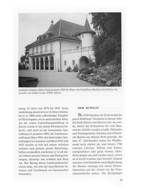 95 Architekt Johann Albert Freytag baute 1929 für Hans von Schulthess-Bodmer das Schloss Au. Ansicht von Süden in den 1930er Jahren.