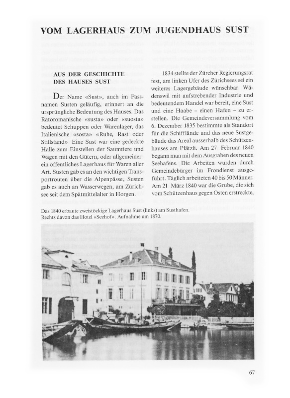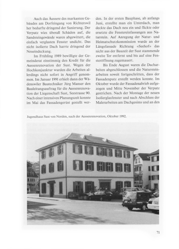 Die mit Wädenswils Vergangenheit eng verflochtene Sust ist ein schlichter, wohlproportionierter Bau unter Walmdach. Kein Wunder, dass das gemeindeeigene Haus bei der Inventarisation wichtiger Baudenkmäler als schützenswertes Gebäude eingestuft und darum 1991 in seinem Äusseren stilgerecht restauriert worden ist.