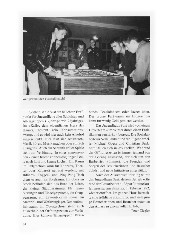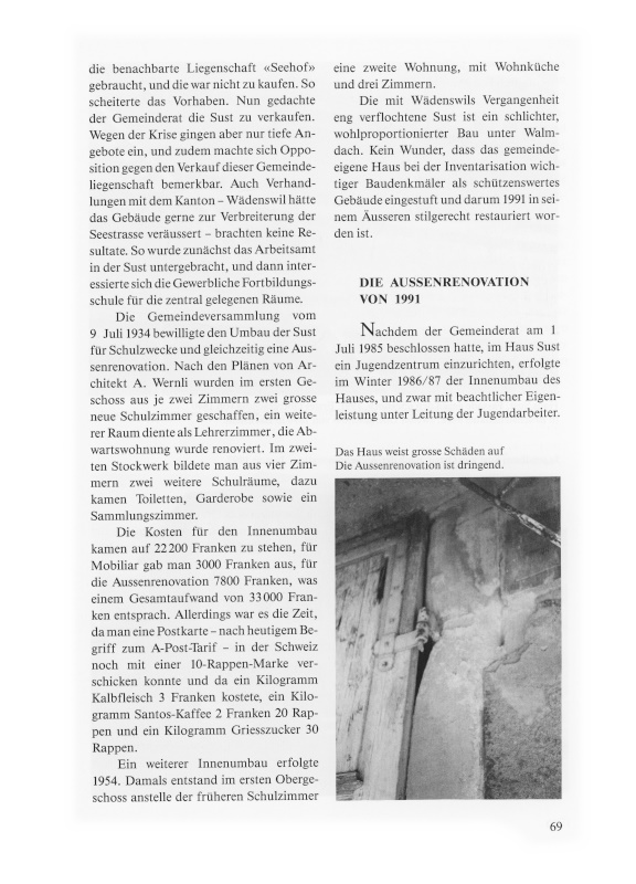 Die Gemeindeversammlung vom 9. Juli 1934 bewilligte den Umbau der Sust für Schulzwecke und gleichzeitig eine Aussenrenovation. Nach den Plänen von Architekt A. Wernli wurden im ersten Geschoss aus je zwei Zimmern zwei grosse neue Schulzimmer geschaffen; ein weiterer Raum diente als Lehrerzimmer; die Abwartswohnung wurde renoviert. Im zweiten Stockwerk bildete man aus vier Zimmern zwei weitere Schulräume, dazu kamen Toiletten, Garderobe sowie ein Sammlungszimmer.